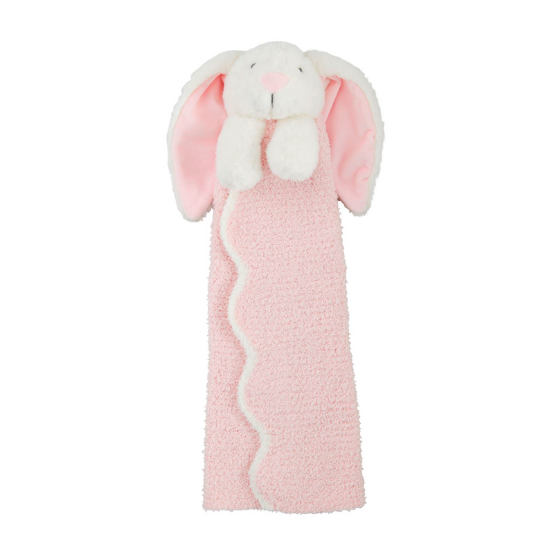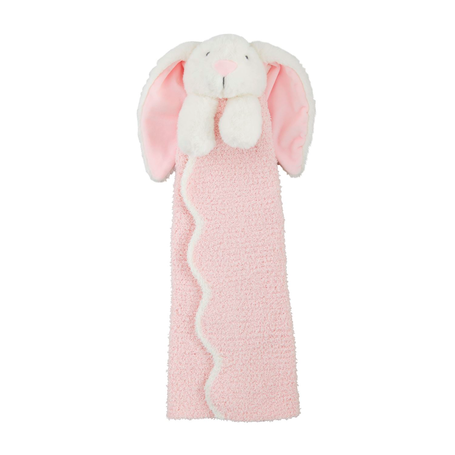 Embroidered faux fur animal with chenille lovey skirt features musical lullaby sound chip.