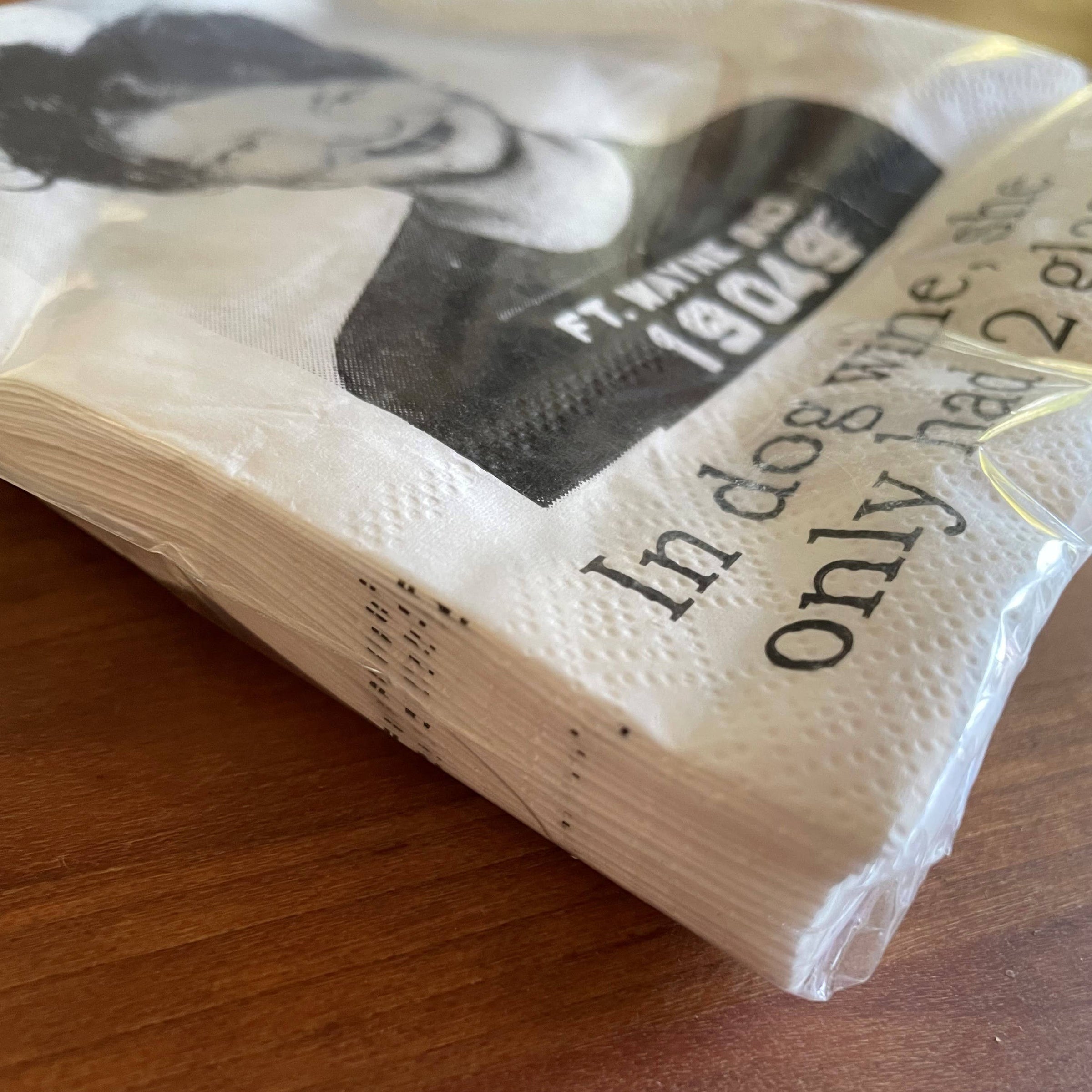All the snarkiness and sassiness of our Big House mugshot line, now on a cocktail napkins. These beauties come in a cellophane wrapped pack of 20 3 ply napkins. Standard cocktail napkin size, 9 7/8" x 9 7/8". Front image is the mugshot and sassiness, the inside and back are wrapped in prison barbed wire. Made in the USA.