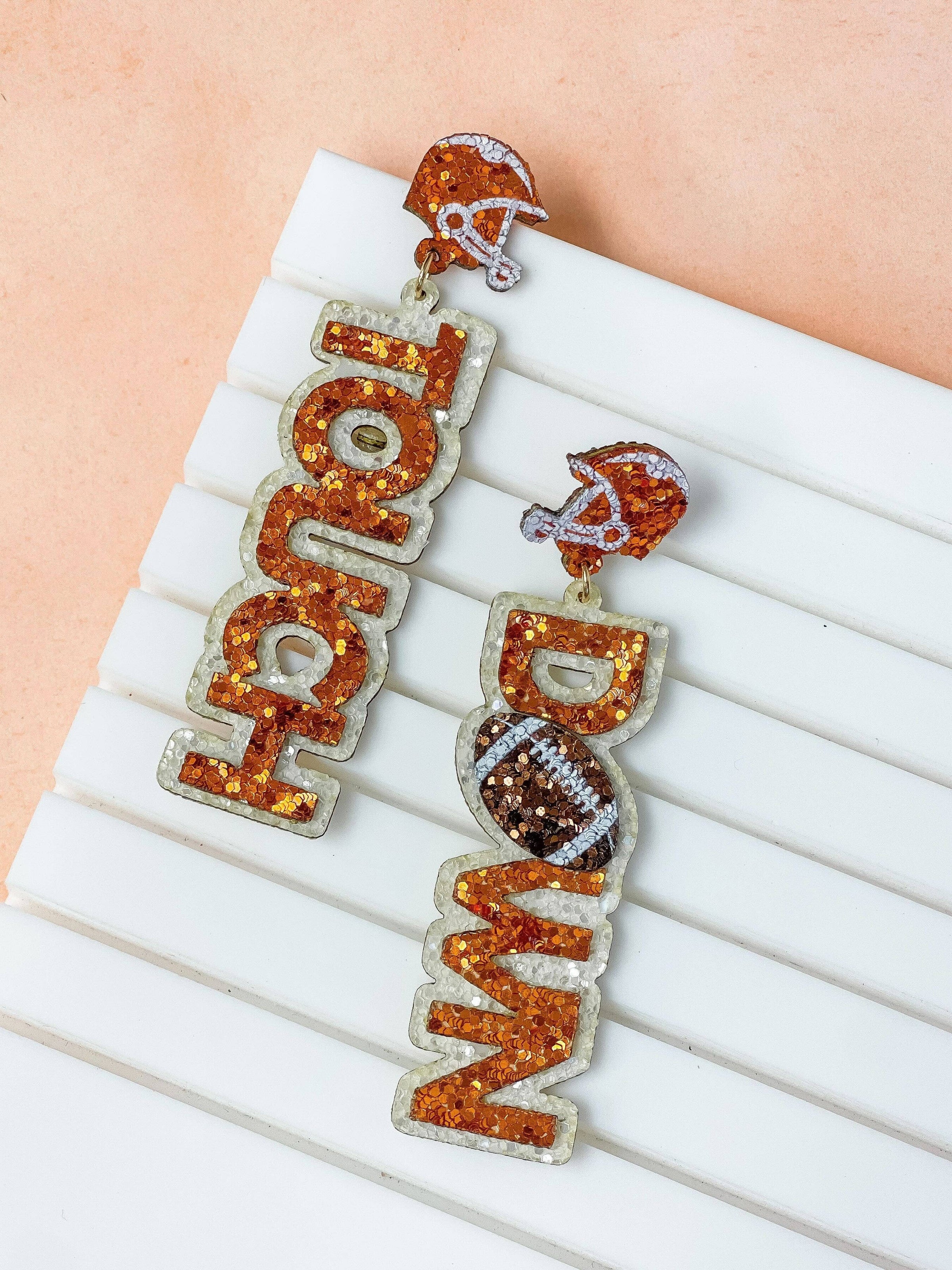 Glitter 'Touch Down' Football Earrings - Orange & White