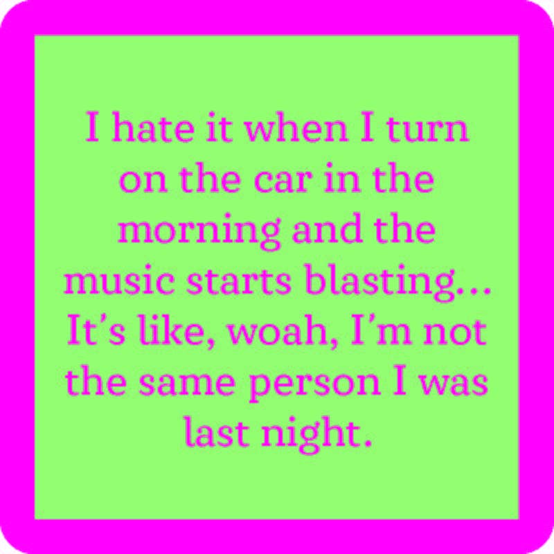 “I hate it when I turn on the car in the morning and the music starts blasting…It’s like, whoa, I’m not the same person I was last night.”