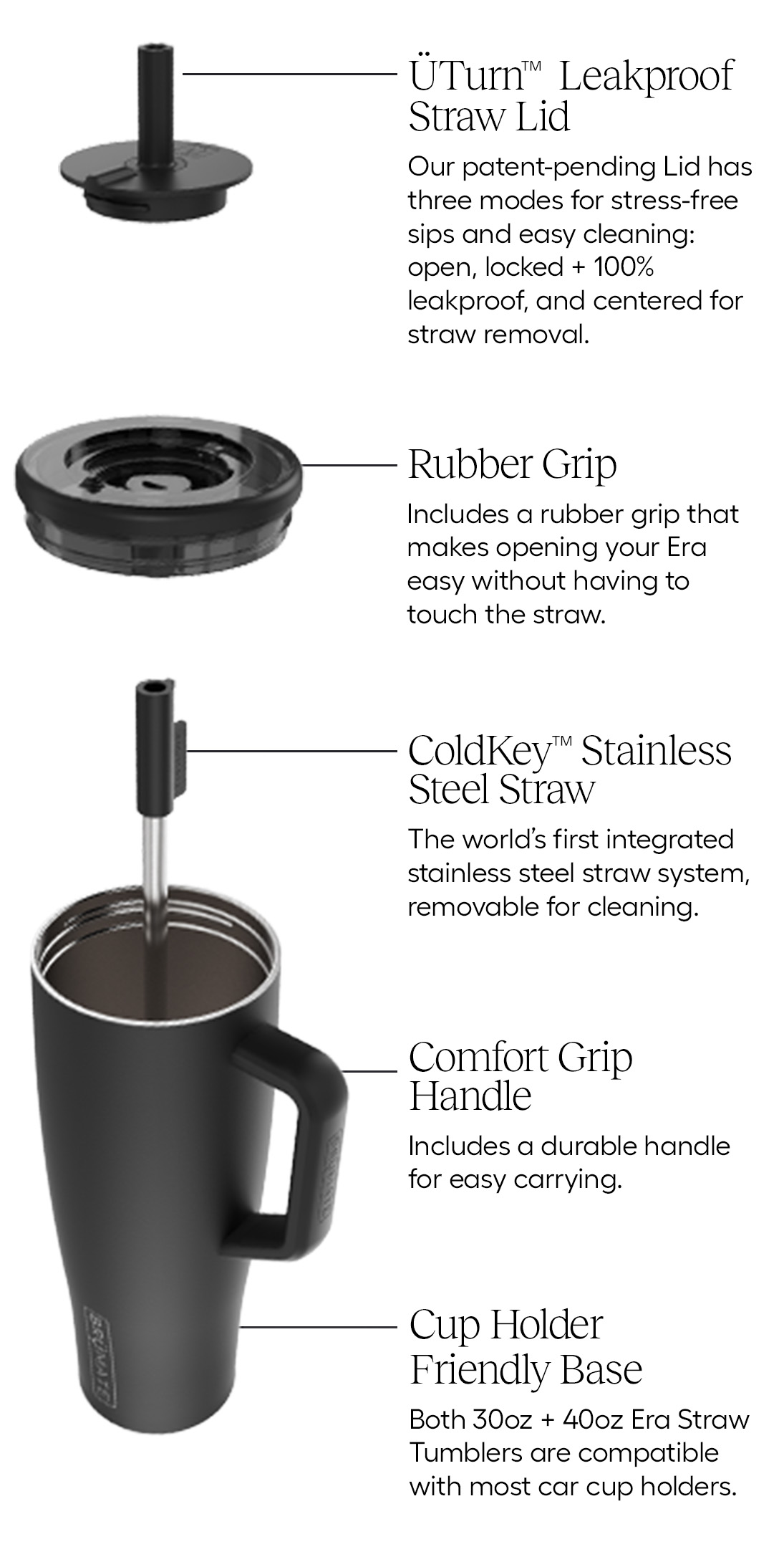 A new Era of straw tumbler is here. Our Era tumbler is totally leakproof, and made for stress free sips on the go. It has our fully leakproof Ü-Turn™ lid that works for both cold and carbonated beverages, ColdKey™ metal straw for minimizing the amount of plastic sitting in your water, BevGuard™ technology to keep ice for 24+ hours, and a cup-holder friendly base so you can enjoy 40oz of your favorite beverage, free of leaks and spills throughout your daily journey.
