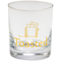 A 9 oz rocks glass displaying a metallic gold design of a toaster with humorous sentiment that reads "Toasted." Our Toasted rocks glass coordinates well with drinkware from our Alcohol Collection. Hand-wash only. A fun everyday kitchen accessory that is also great for gifting.