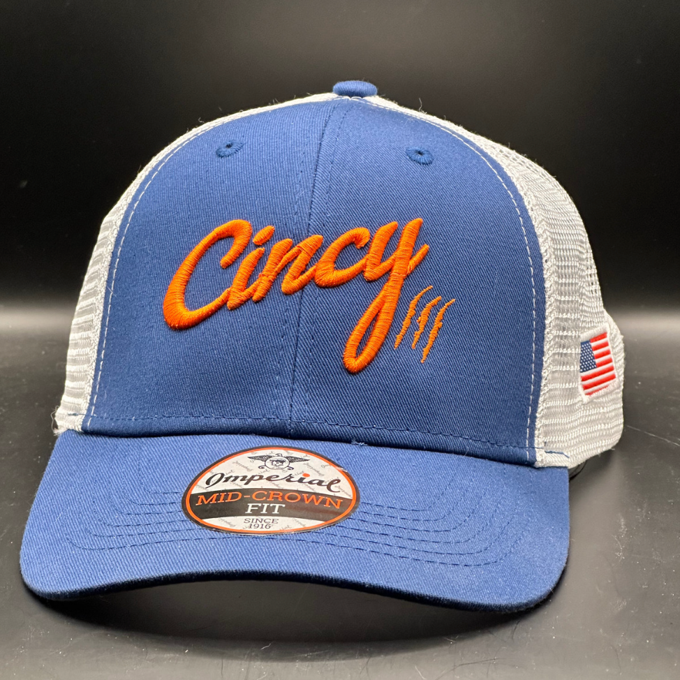 Mesh Back Hat in Blue with Orange Cincy Logo by The Cincy Hat
