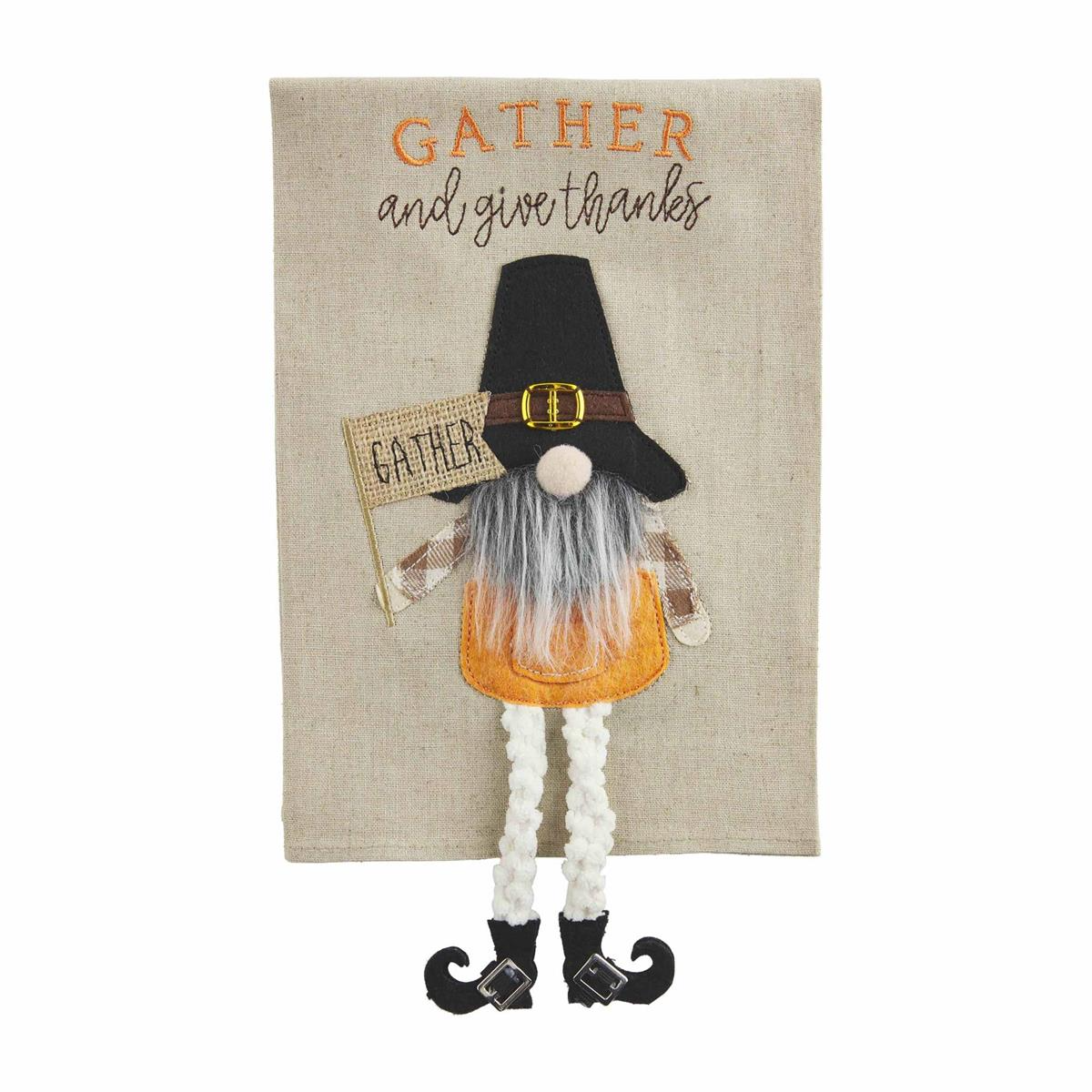 Cotton hand towel features embellished gnome applique with knit dangle legs.