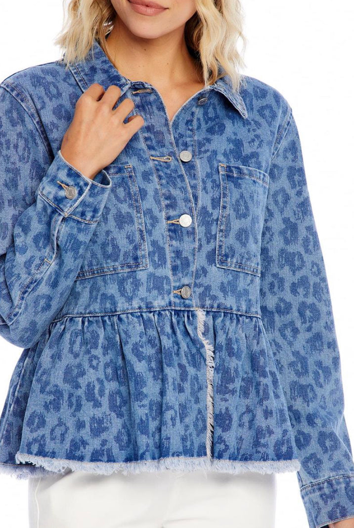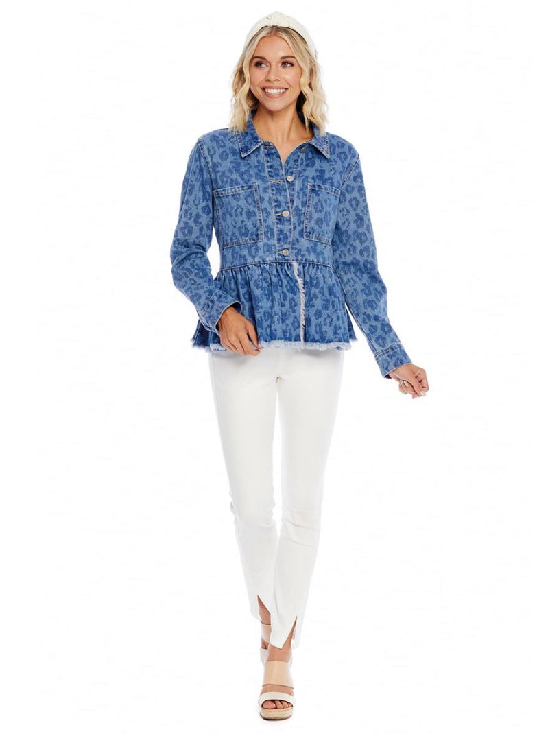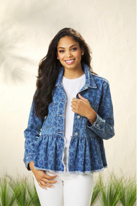 Cotton denim jacket features button front placket, chest pockets and peplum waist with raw edge hem. Measures approximately 23 3/4" from shoulder to hem on size small.