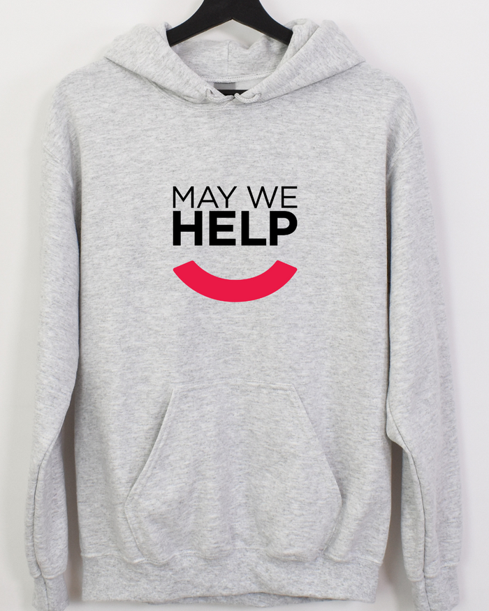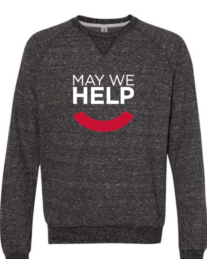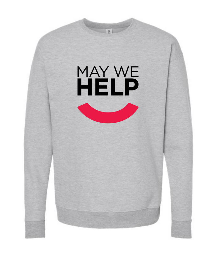 May We Help (Black/Red) on Athletic Heather Crewneck- Unisex