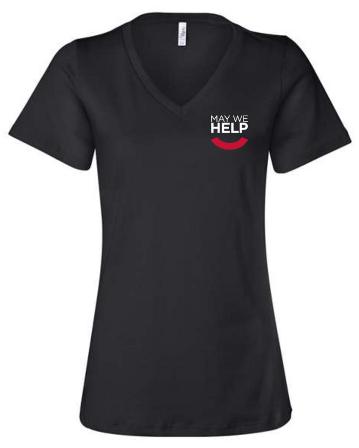 May We Help (Red/White) on Women's Black Short Sleeve V-Neck Tee