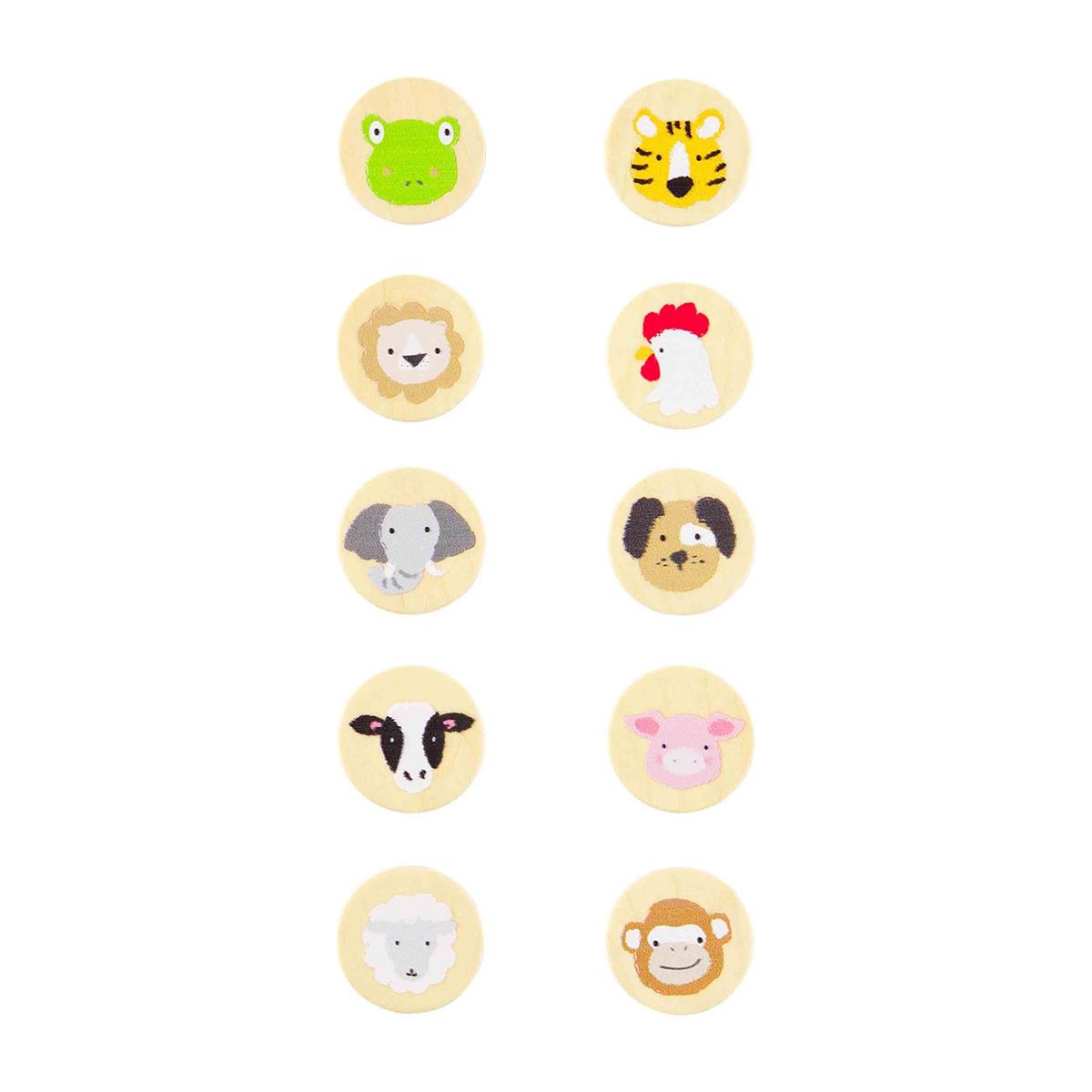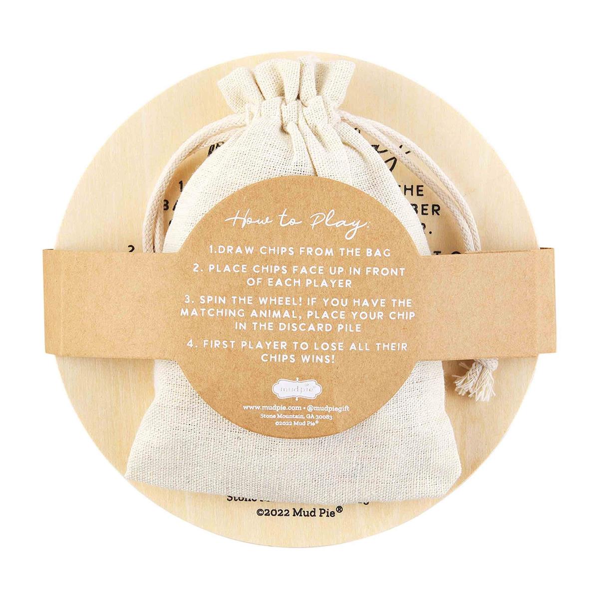 11-piece set. To play: Deal wooden animal chips, spin the wooden wheel and discard the matching animal chip. First player to lose all chips, wins! Comes with drawstring canvas storage bag. Easy-to-play first game. Ages 3+.
