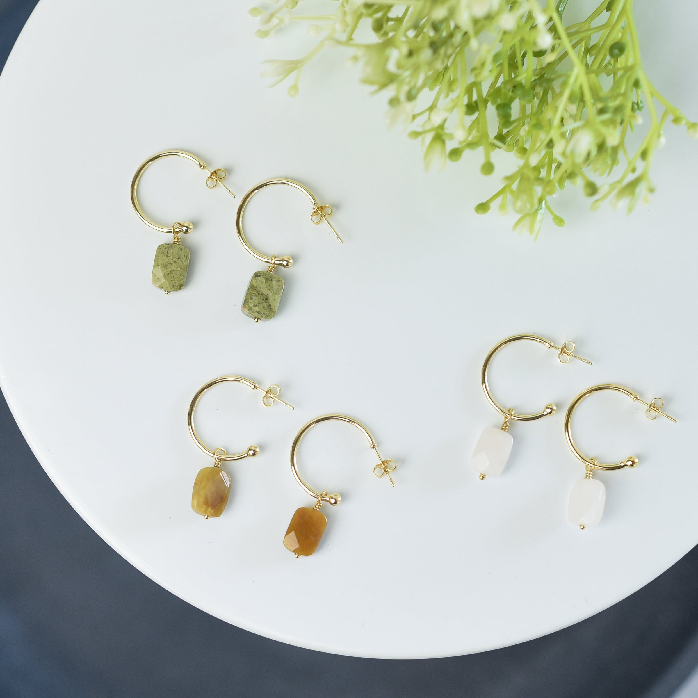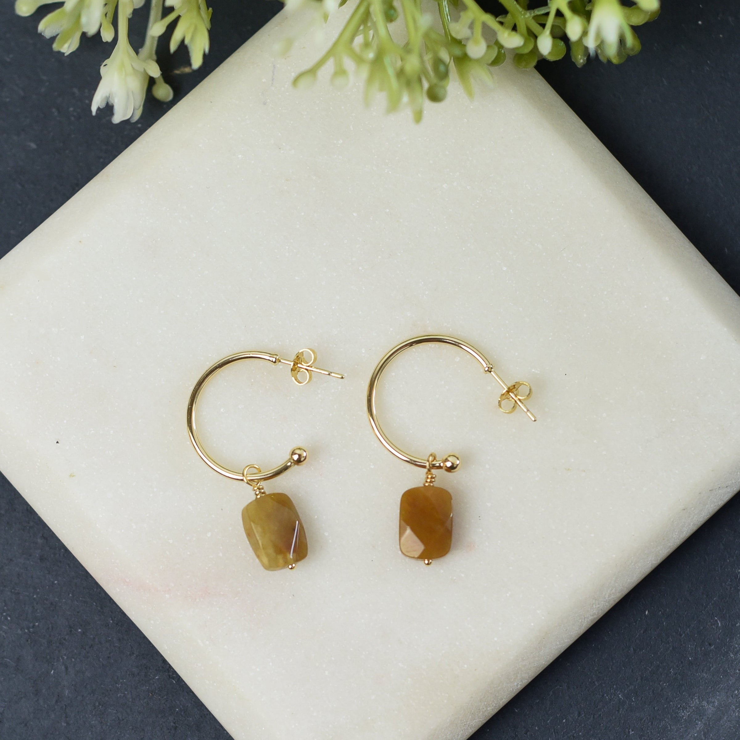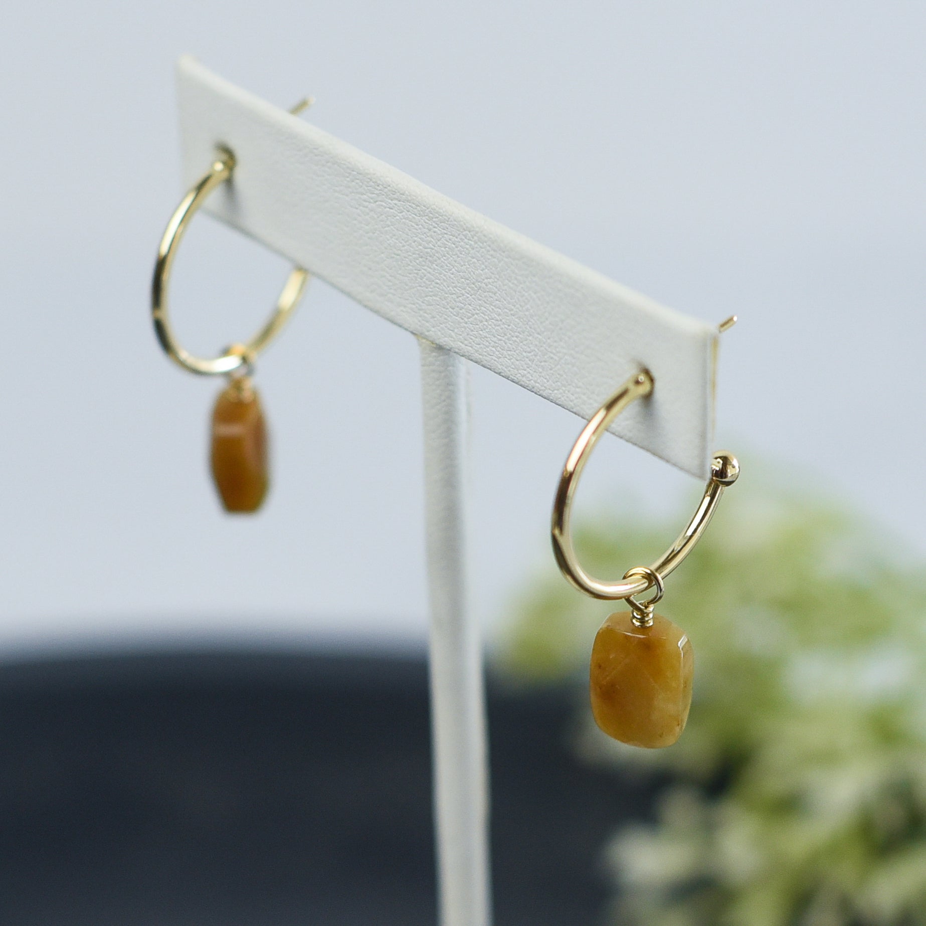 Delicate forward hoops with gemstone dangle. Color variations may occur.