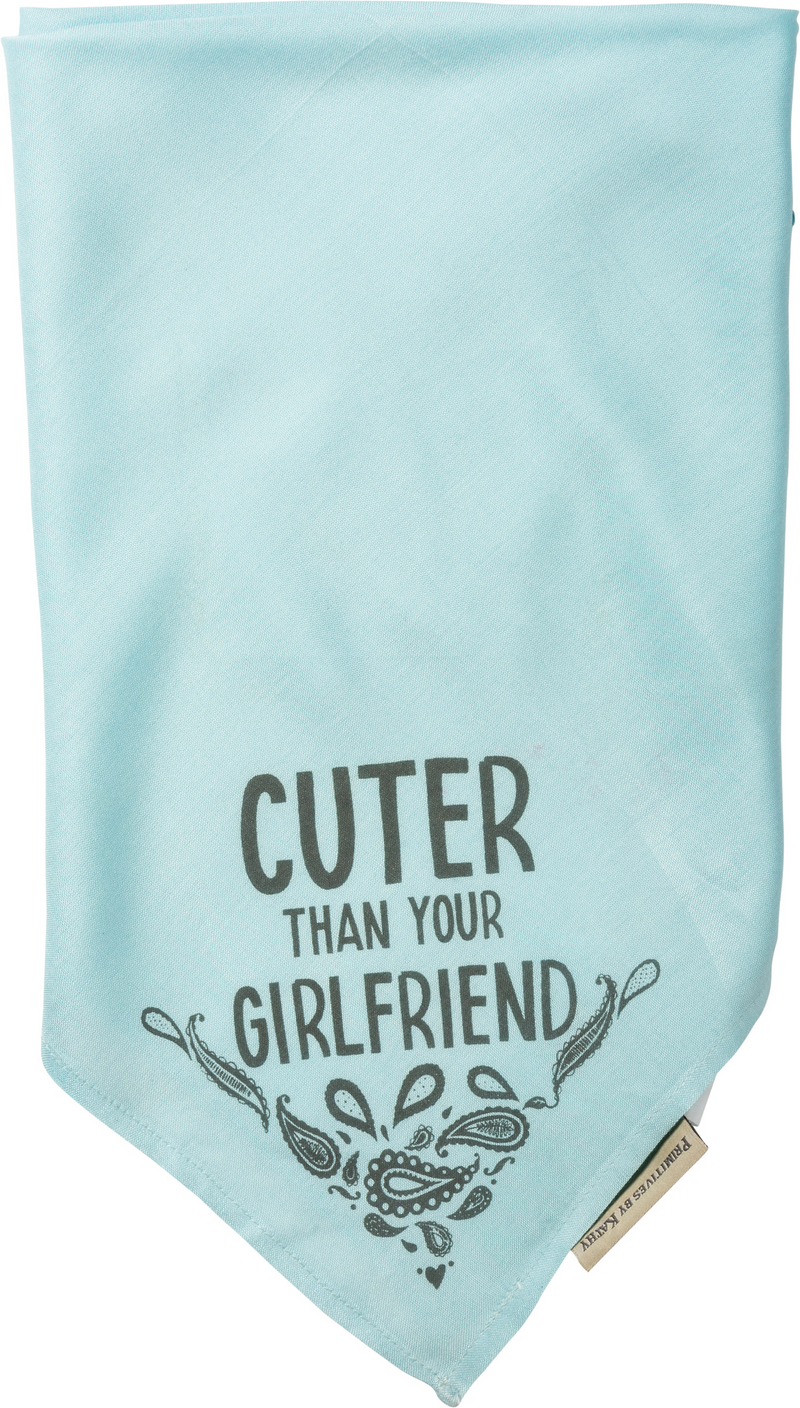 A large blue pet bandana lending a "Cuter Than Your Girlfriend" sentiment. Bandana is made of soft rayon to resist stains. Machine-washable.