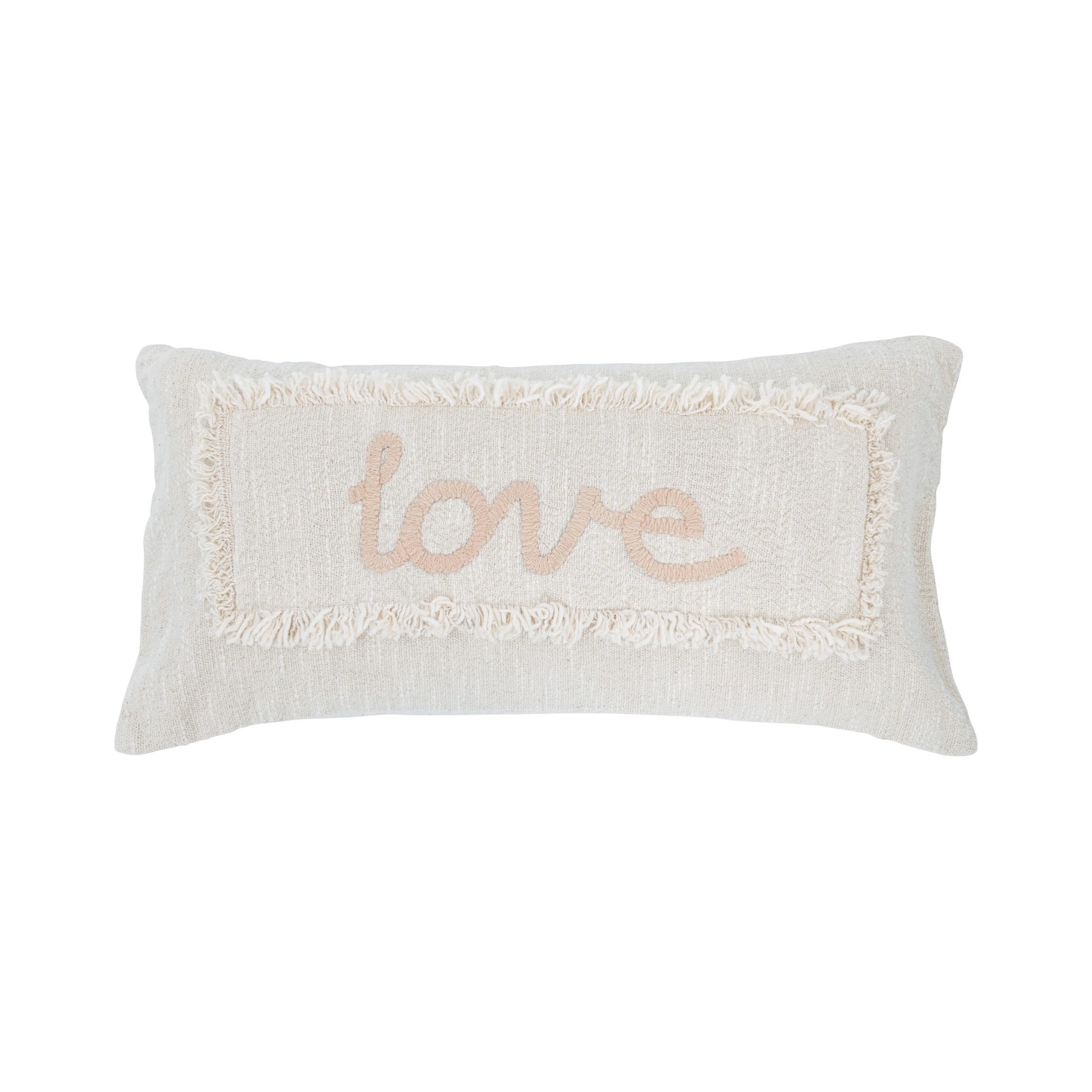 Cotton Embroidered Lumbar Pillow w/ Eyelash Fringe "Love", Pink & Cream Color