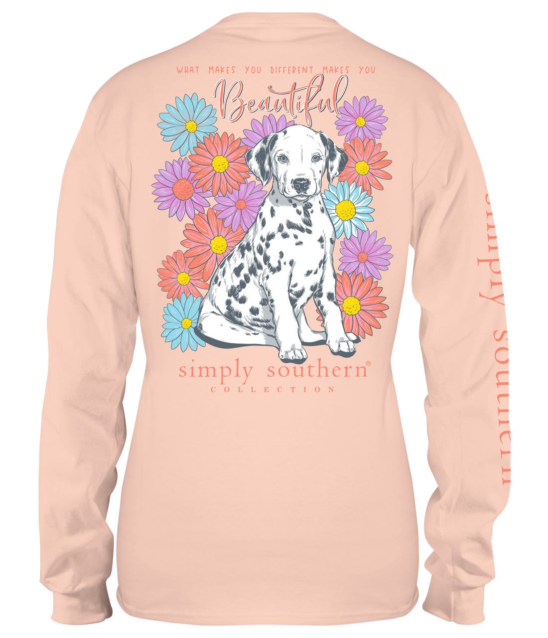 Creme long sleeve shirt with a Dalmation sitting in front of a background of multicolored flowers and the phrase WHAT MAKES YOU DIFFERENT MAKES YOU BEAUTIFUL. Simply Southern logo below, on left chest, and right sleeve. Pre-shrunk and ring-spun 100% cotton. Unisex sizing.