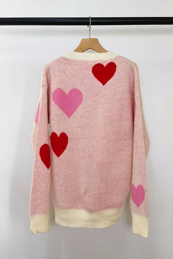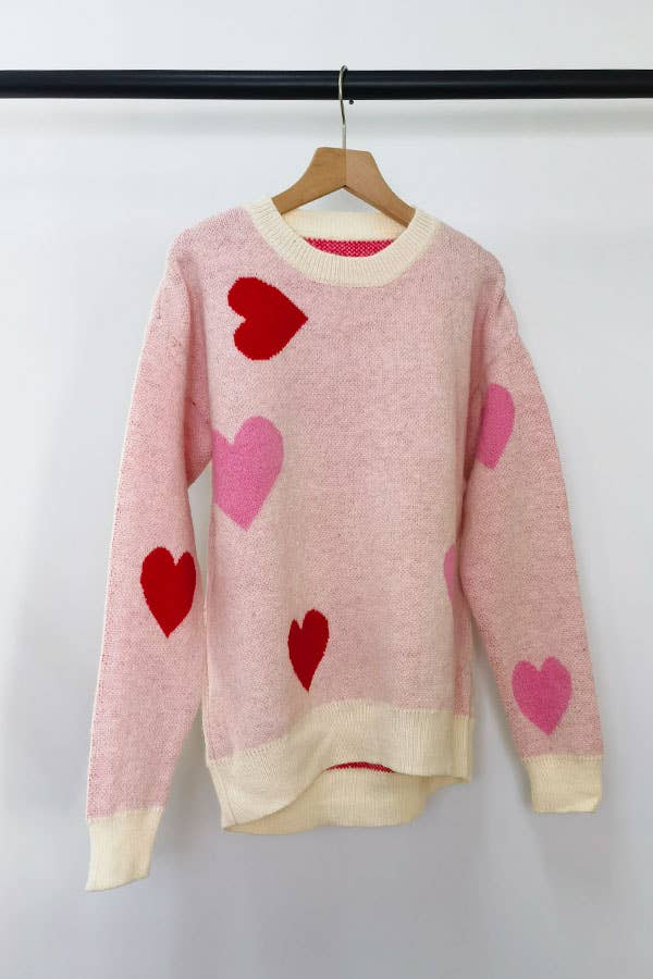 Blush tone heart shape jacquard sweater, round neck, long sleeve and rib trim.