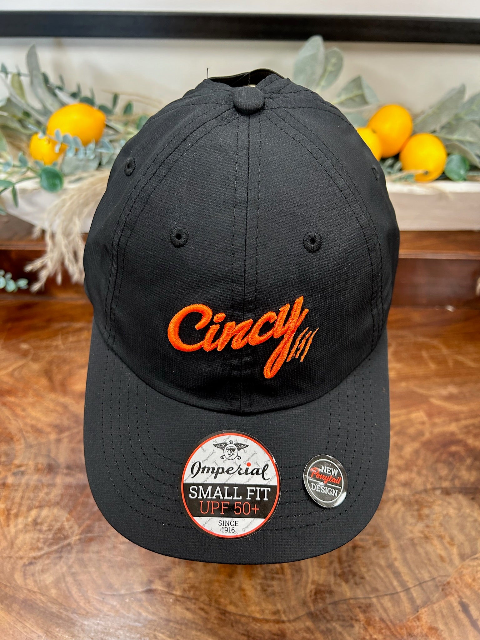 Ponytail Hat in Black with Orange Cincy by The Cincy Hat