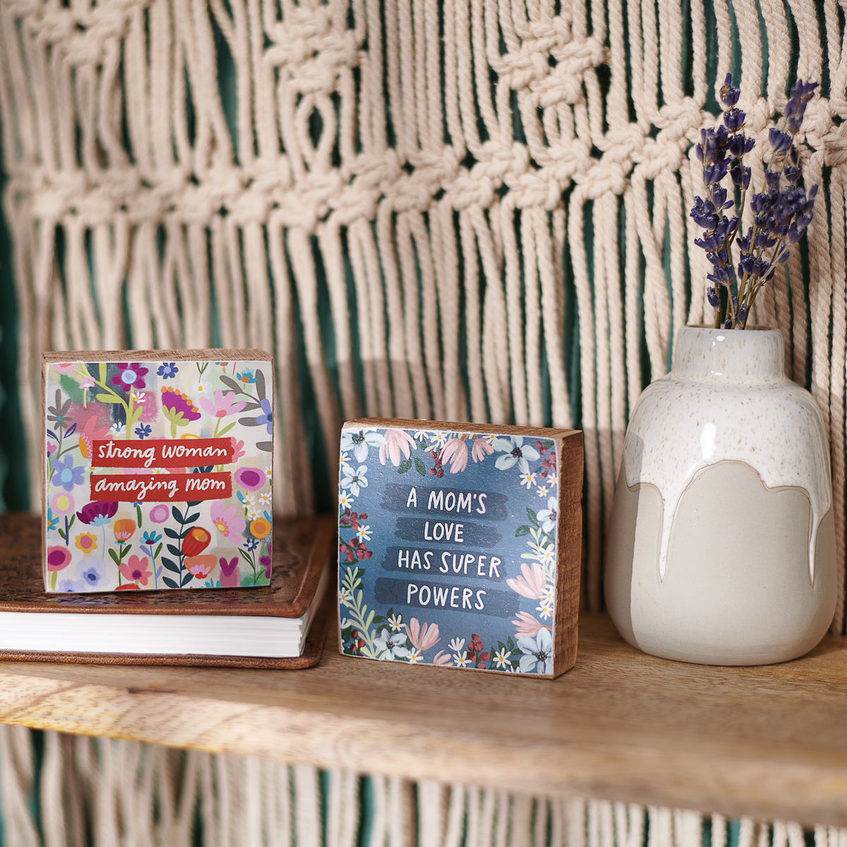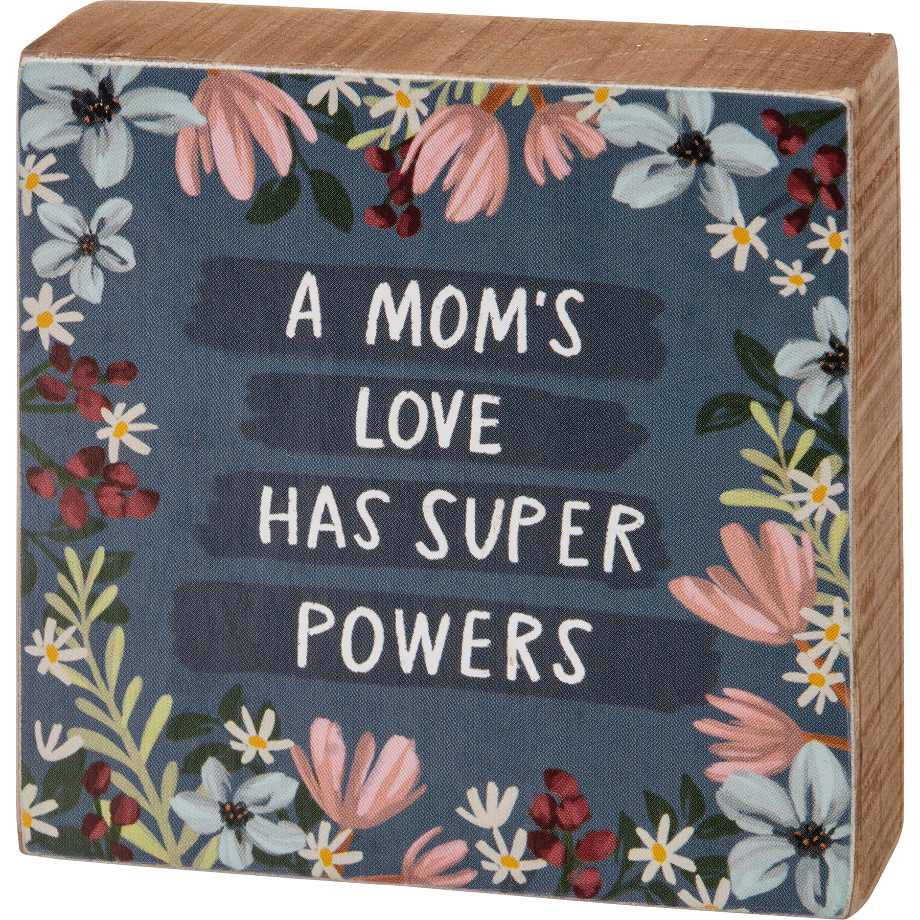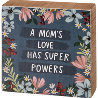 A wooden block sign featuring a vibrant color palette with whimsical floral designs and inspirational words. Sentiment reads "A Mom's Love Has Super Powers". Wooden wall art is easy to hang via predrilled keyhole slot or can free-stand alone. Features natural wood sides.