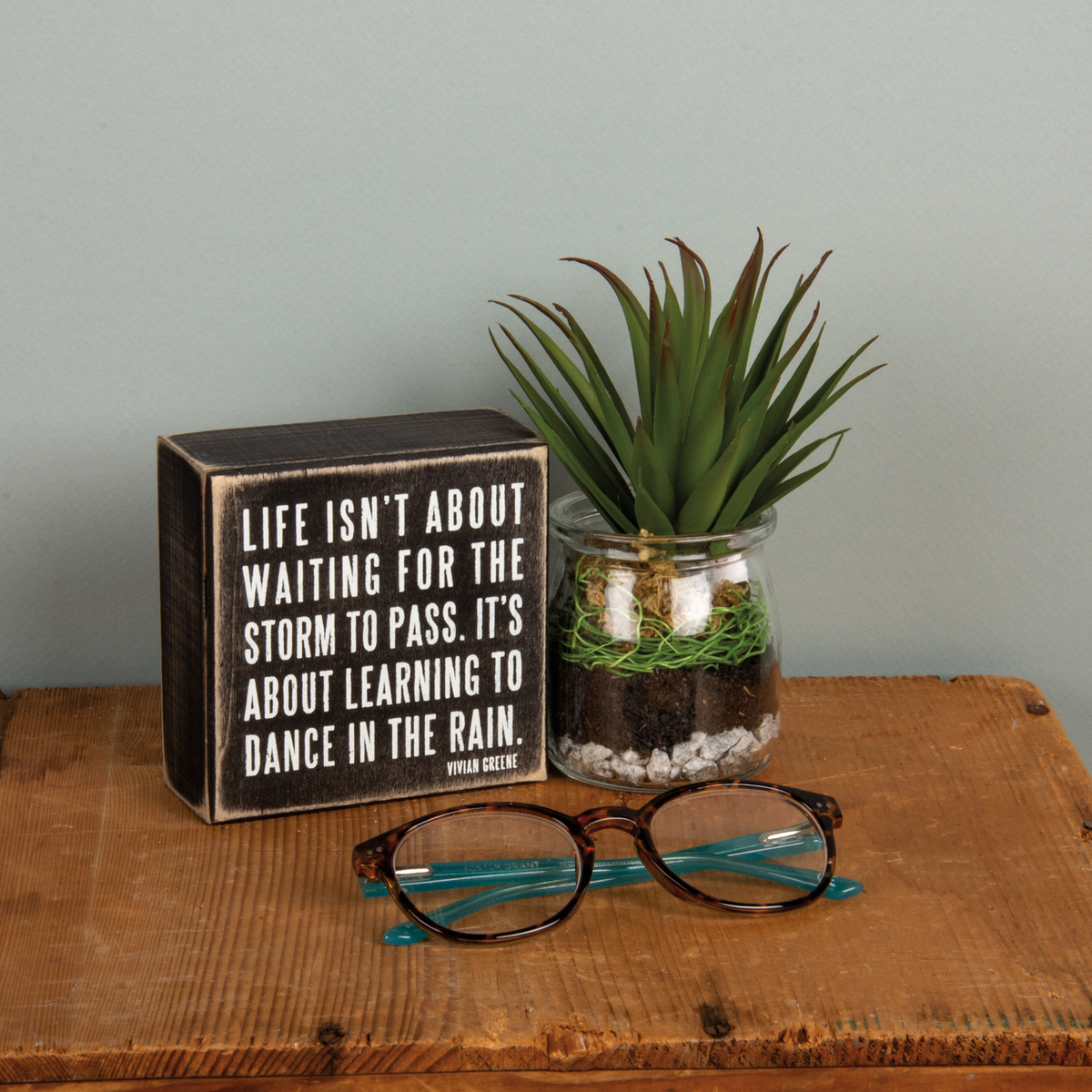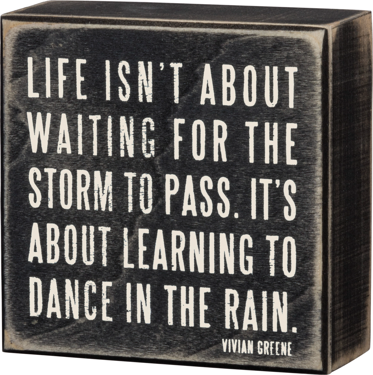 A classic black and white wooden box sign featuring a distressed "Life Isn't About Waiting For The Storm To Pass. It's About Learning To Dance In The Rain. - Vivian Greene" sentiment. Easy to hang or can free-stand alone. Not eligible for discounting.