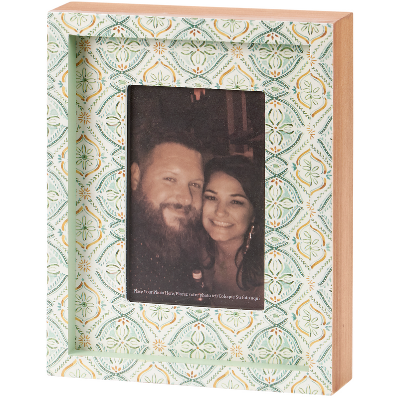 A picture frame in an inset box sign style from our Botanical Collection displaying a hand painted mosaic pattern in a green color palette with coordinating natural wood on the sides and back. Box frame fits a 4 inch x 6 inch photo and can easily be replaced via clips on back. Our Green Mosaic photo frame is easy to hang or can free-stand alone. A charming everyday home accent perfect for displaying memories in any room.