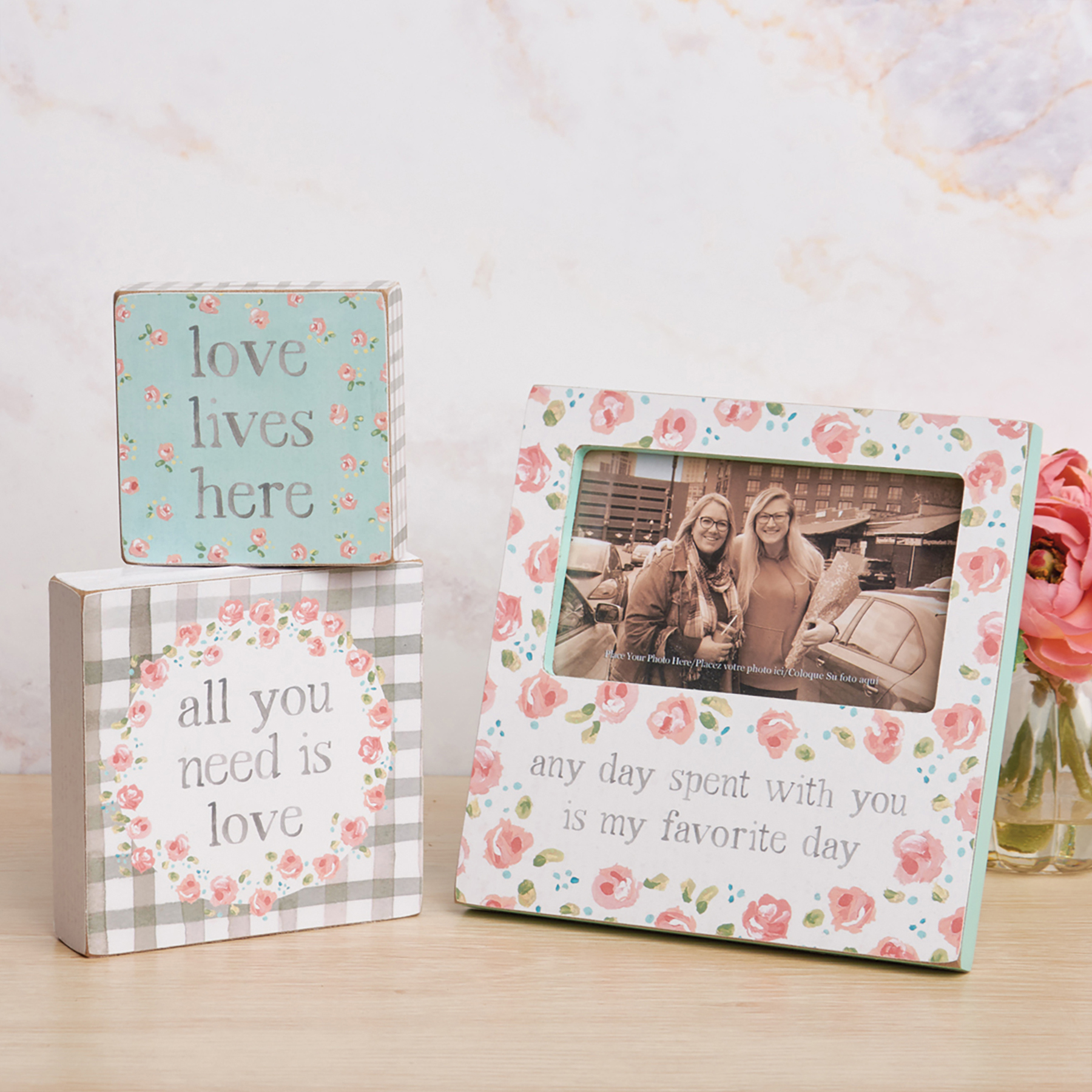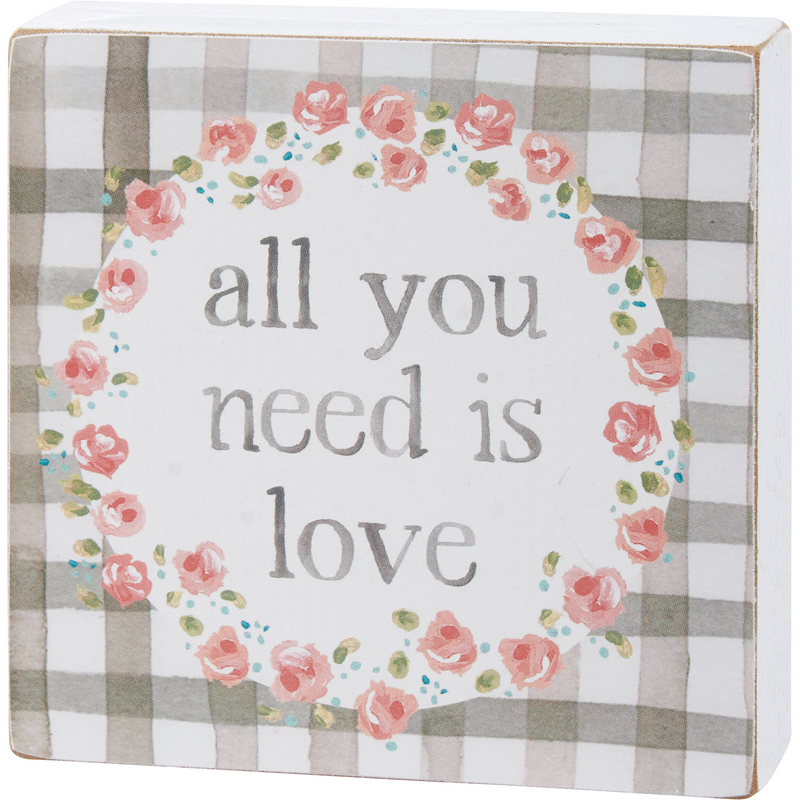 A charming wooden block sign from our Mother's Day Collection displaying watercolor design of pink flowers surrounding a "All You Need Is Love" sentiment on gray gingham background. Sign features coordinating white sides and back for added interest. Our All You Need Is Love block sign is easy to hang via predrilled keyhole slot or can free-stand alone.
