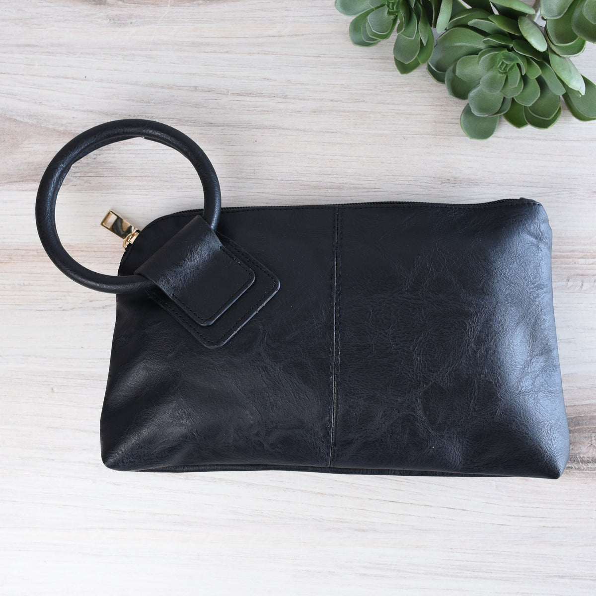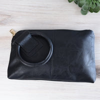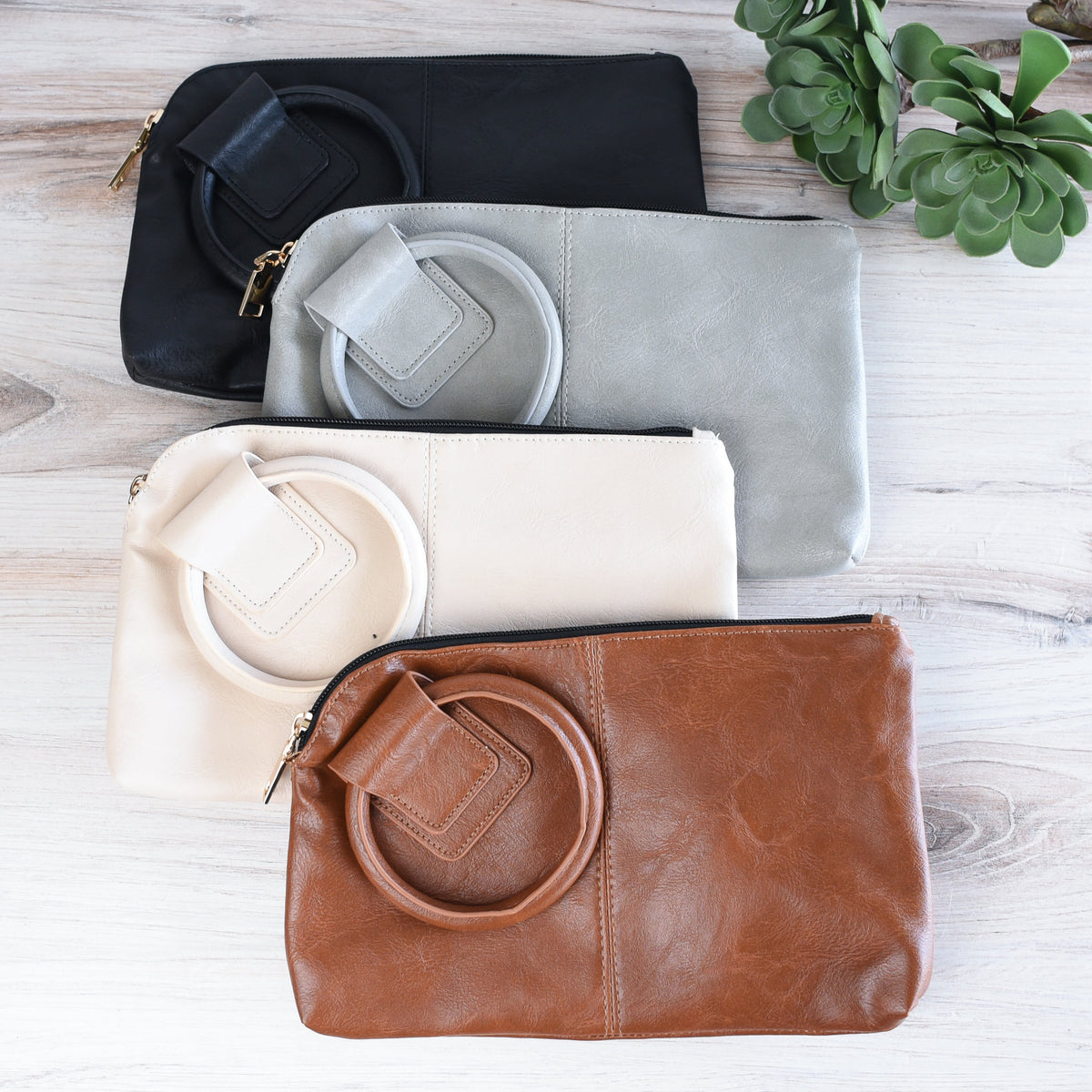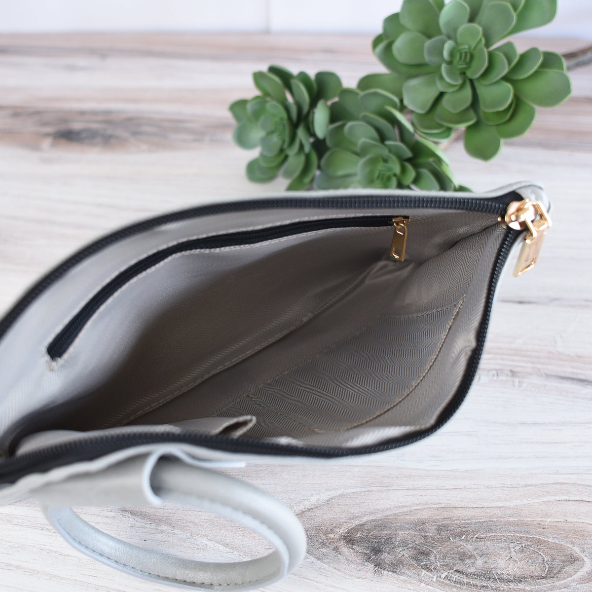 This soft faux leather clutch measures 10.5 x 6.75 inches. With a beautiful matching bangle for easy carry, it also includes a zipper pocket and 2 open slide in pockets on the inside. This bag is perfect for the every day or to add some punch to an outfit.