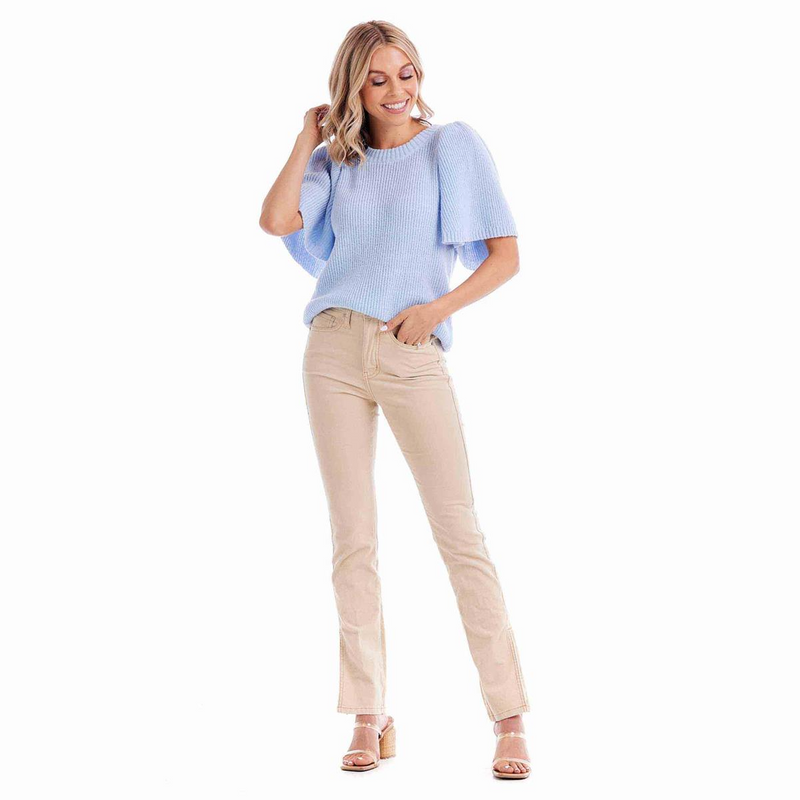 Knit sweater features oversized flounce short sleeves and ribbed neckline and hem. Measures approximately 23" from shoulder to hem on size small.