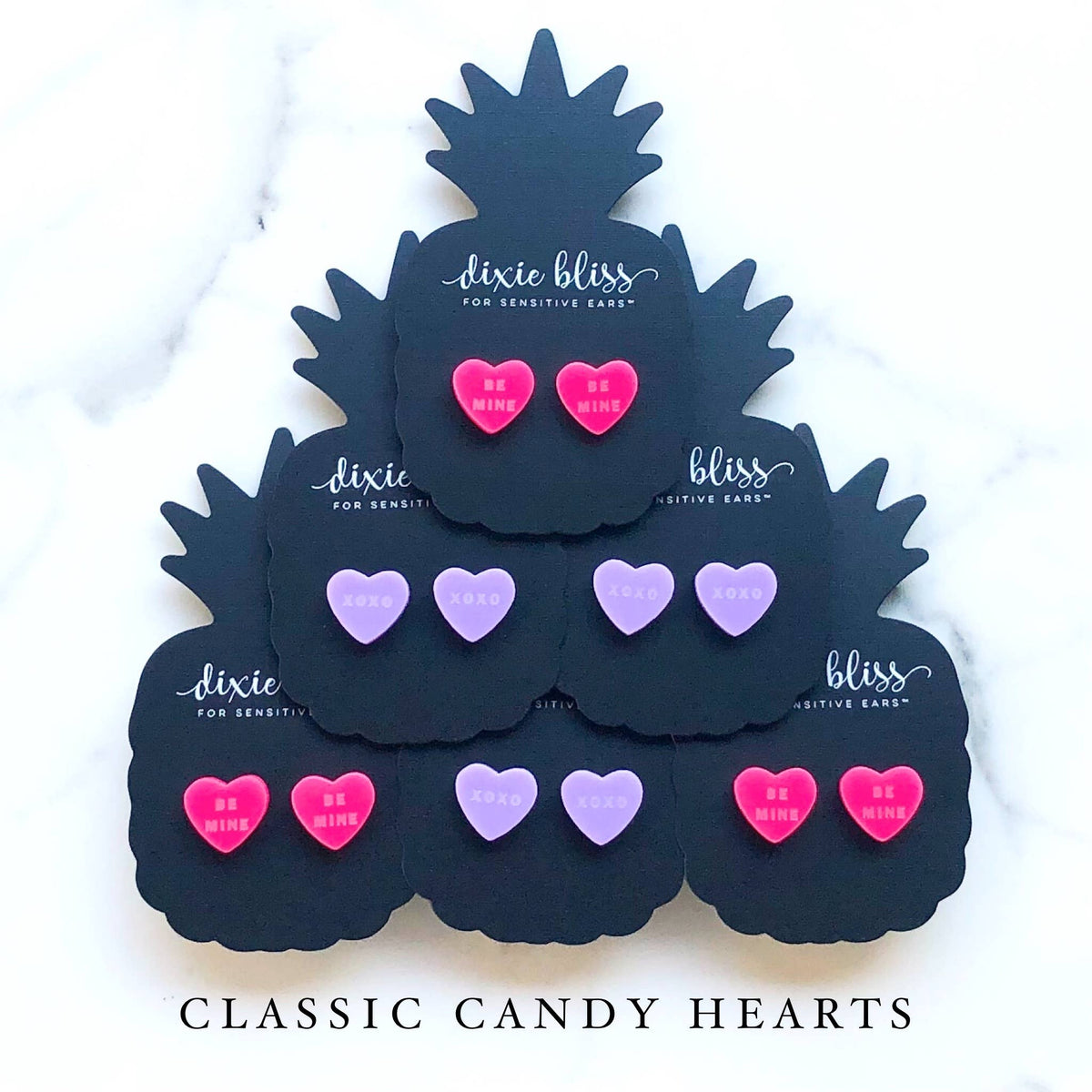 Classic Candy Hearts features 3 each: BE MINE Heart in Hot Pink Acrylic, XOXO Heart in Lavender Acrylic All hypoallergenic surgical stainless steel posts *Great for sensitive ears *Made in the USA