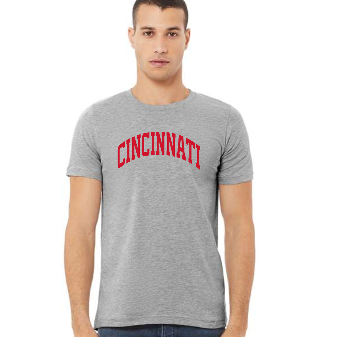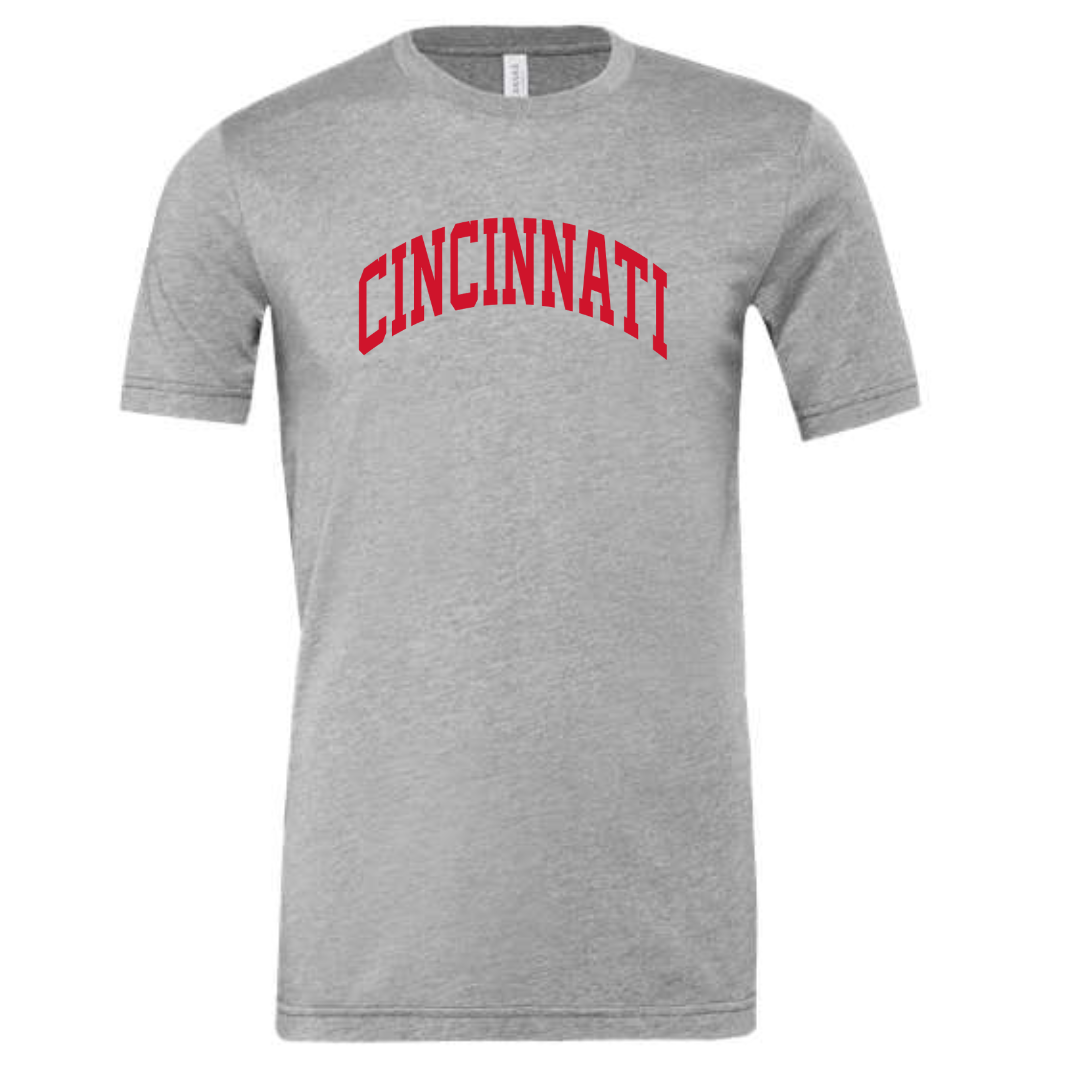 Cincinnati Red Block Curve T-Shirt on Athletic Gray