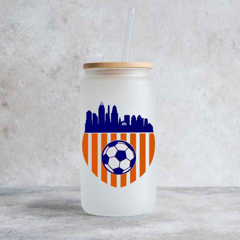 Cincinnati Soccer Skyline Glass Tumbler with Wooden Lid and Glass Straw