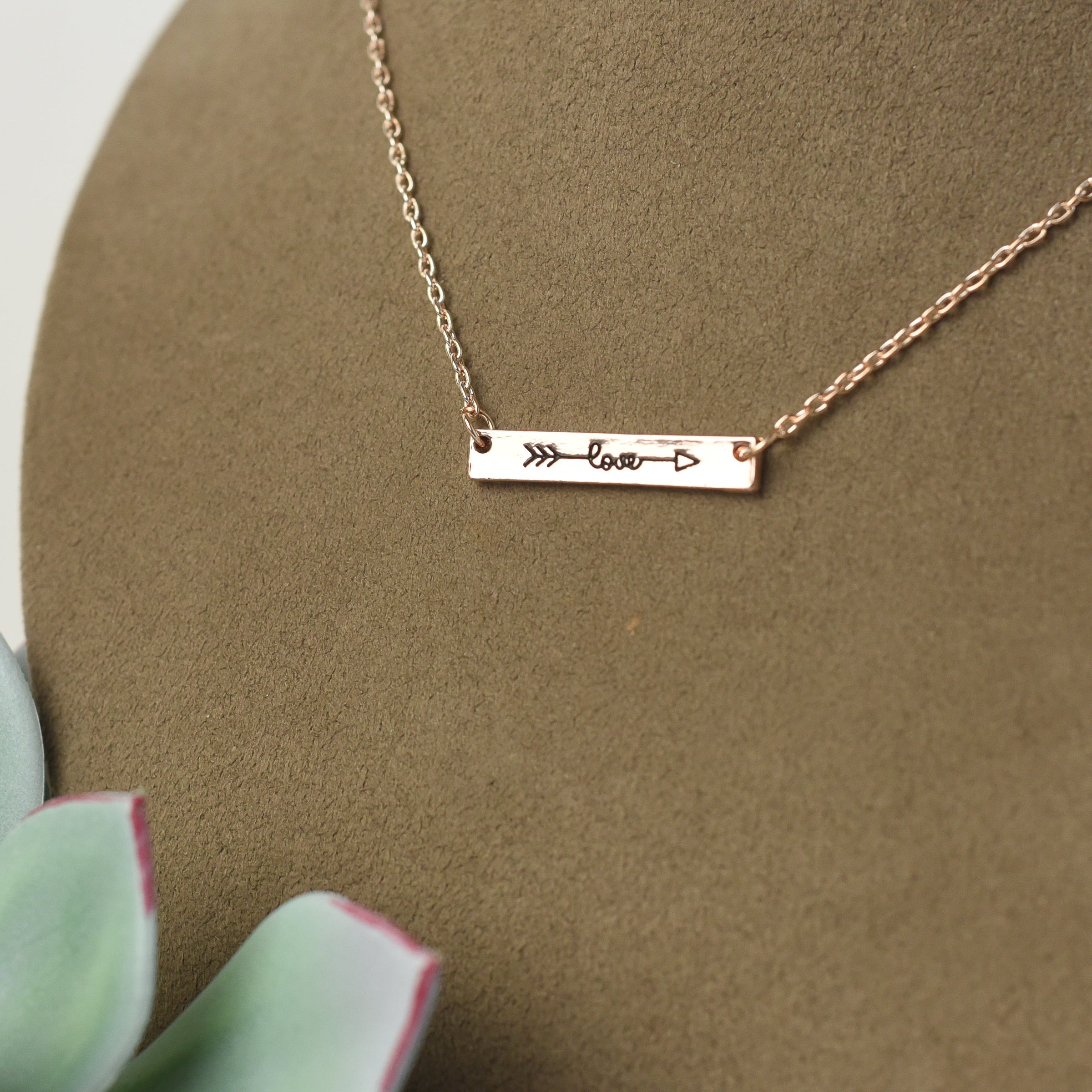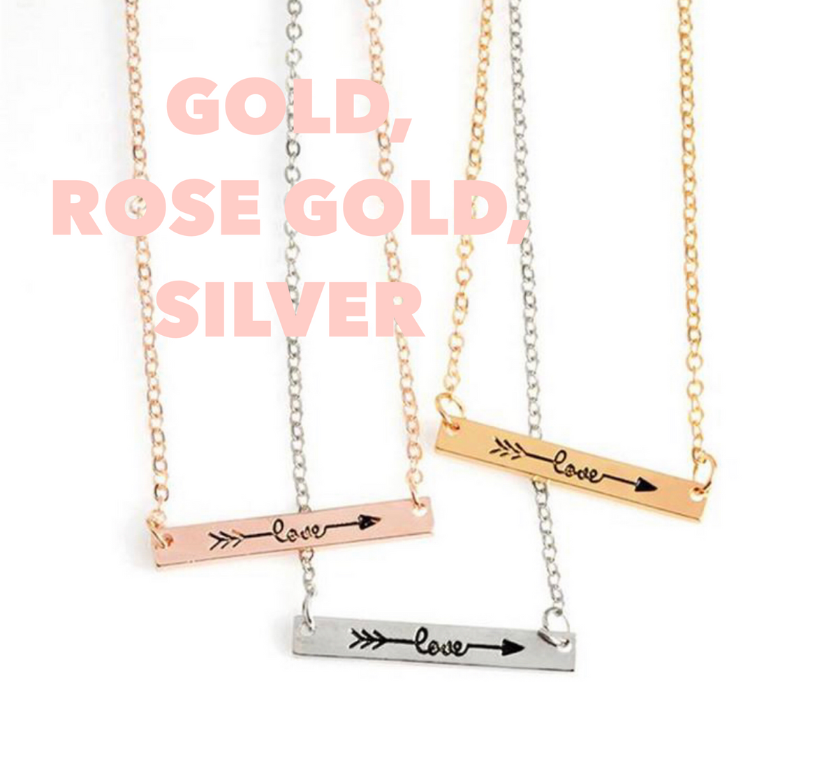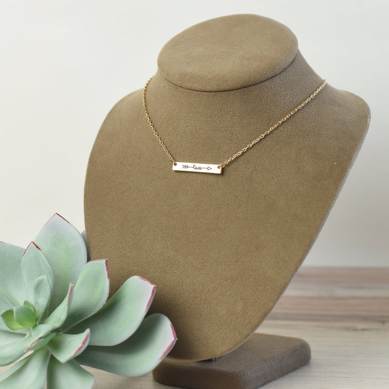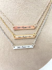 A detailed and feminine love and arrow bar pendant on an 18" chain with a 2" extender. Available in silver, gold, and rose gold.