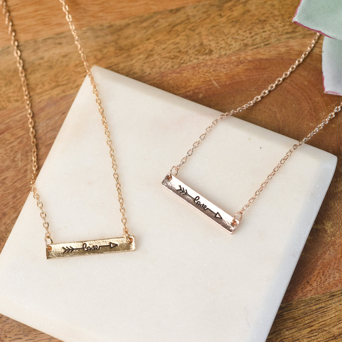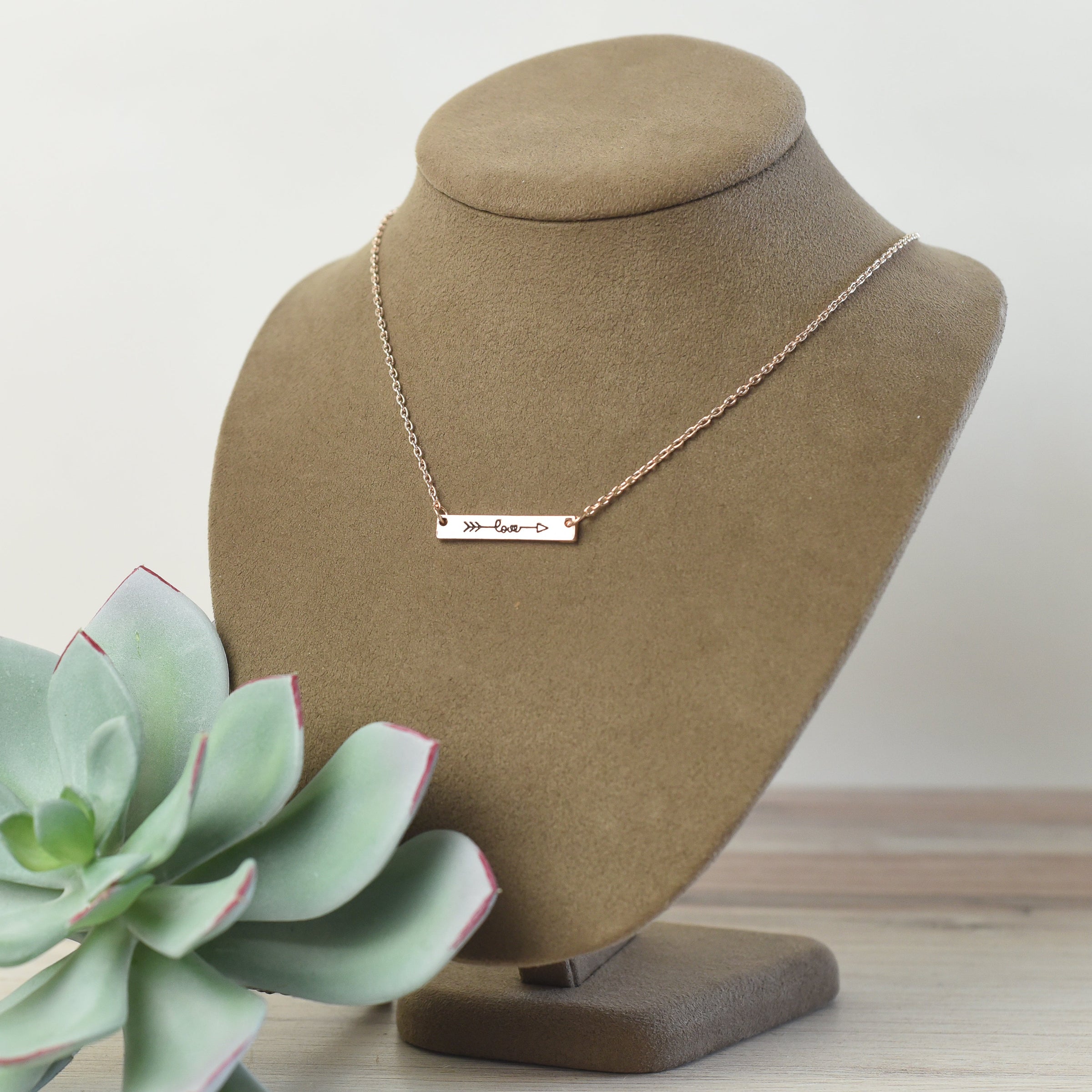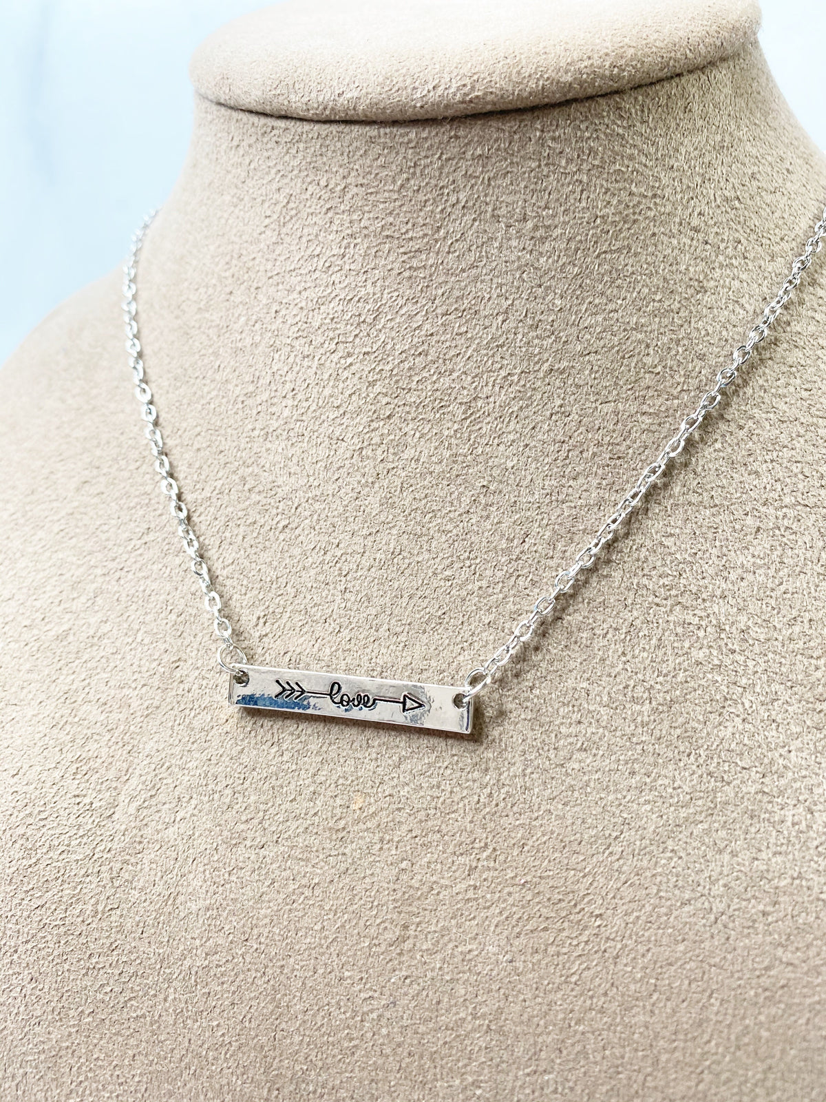 A detailed and feminine love and arrow bar pendant on an 18" chain with a 2" extender. Available in silver, gold, and rose gold.