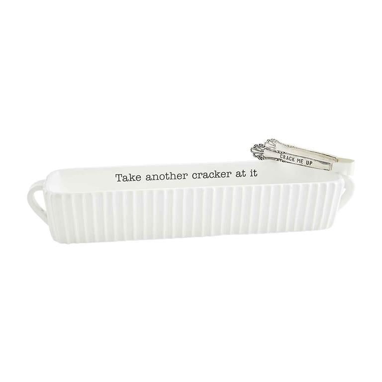 Crack your friends up with our Fluted Cracker Dish Set. The two piece set comes with a fluted ceramic cracker dish. The cracker dish features side handles. The dish features the sentiment "Take another cracker at it". The dish also comes with stamped silver-plate tongs that read "Crack me up".