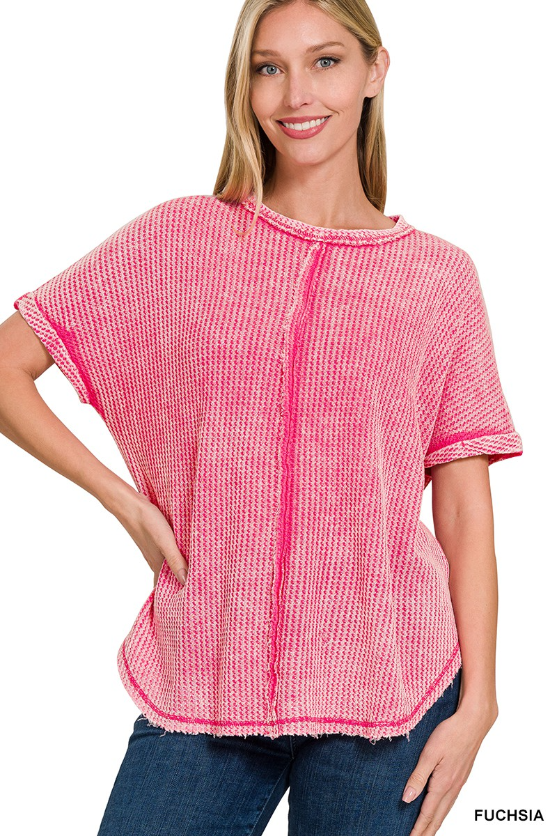 BABY WAFFLE SHORT SLEEVE TOP - RAW EDGE DETAILS - ROUND HEM - BACK PATCH * Each item is unique, expect variations in color and finishing