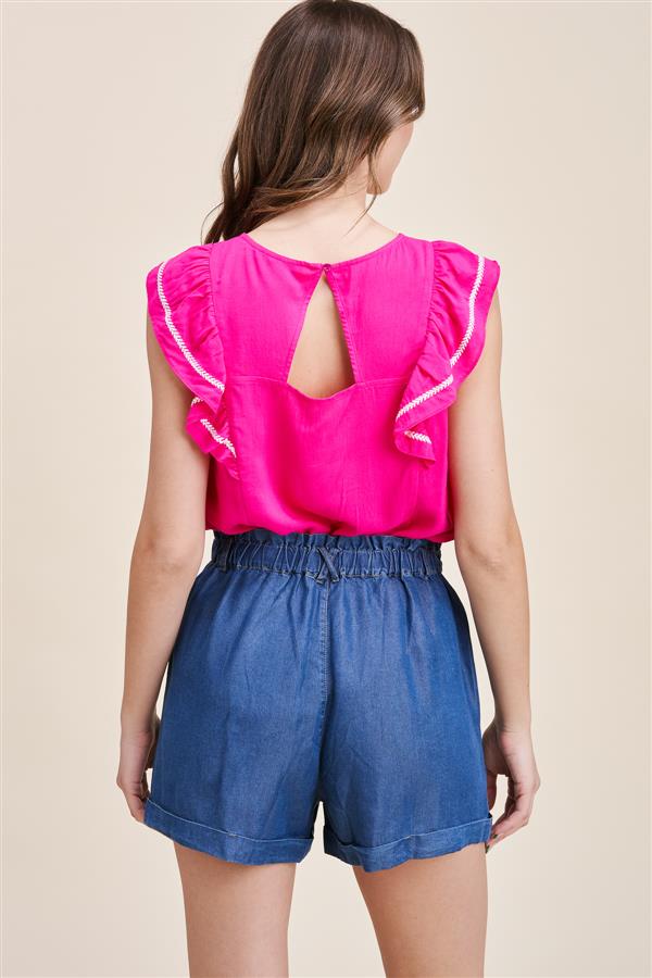 RUFFLE DETAILED TOP, NON-FUNCTIONAL BUTTON FRONT, SIDE POCKETS, PAPERBAG, WASHED TENCEL SHORTS