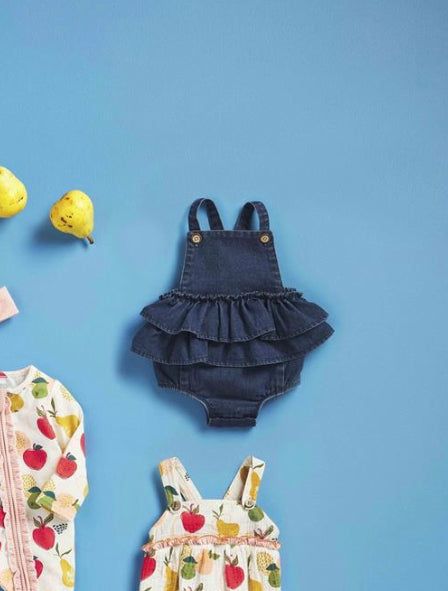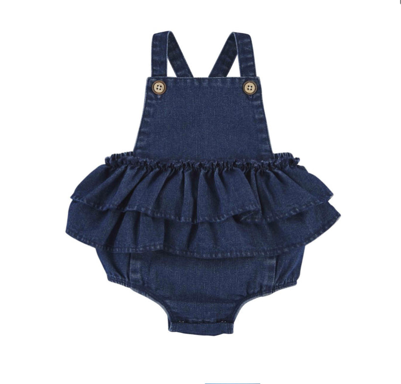 Denim bubble with wood button straps and tiered ruffle waist.
