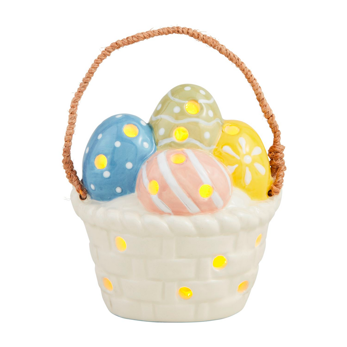 Hand-painted ceramic sitter with cut-out LED light-out detail. Battery included