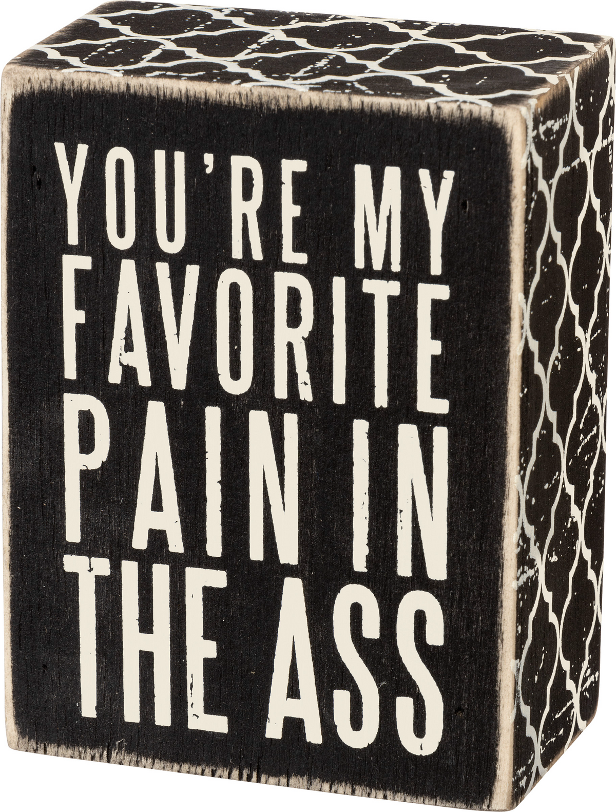A classic black and white wooden box sign featuring a distressed "You're My Favorite Pain In The Ass" sentiment with tile print trim designs. Easy to hang or can free-stand alone.