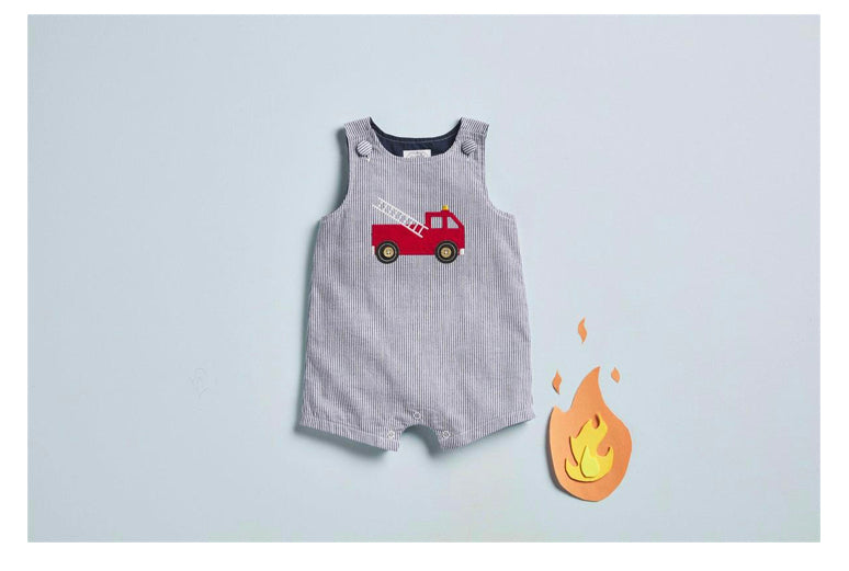 Seersucker jon jon features button shoulders and fire truck applique.