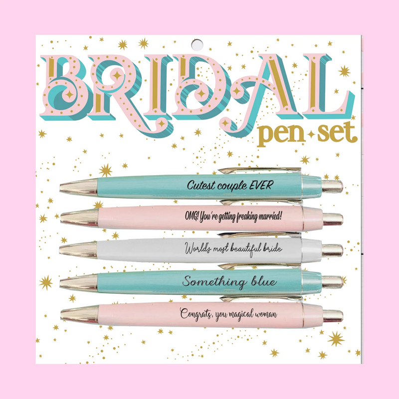 NEW NEW NEW! Looking for something naughtier? Don't miss our bachelorette pen set!! Pen sets are our best selling category! These pens should be in by May. Order now and make sure you get them when our first round comes in! Set of 5 black ink ballpoint pens. Cutest couple EVER OMG! You're getting freaking married! World's Most Beautiful Bride Something Blue Congrats, you magical woman