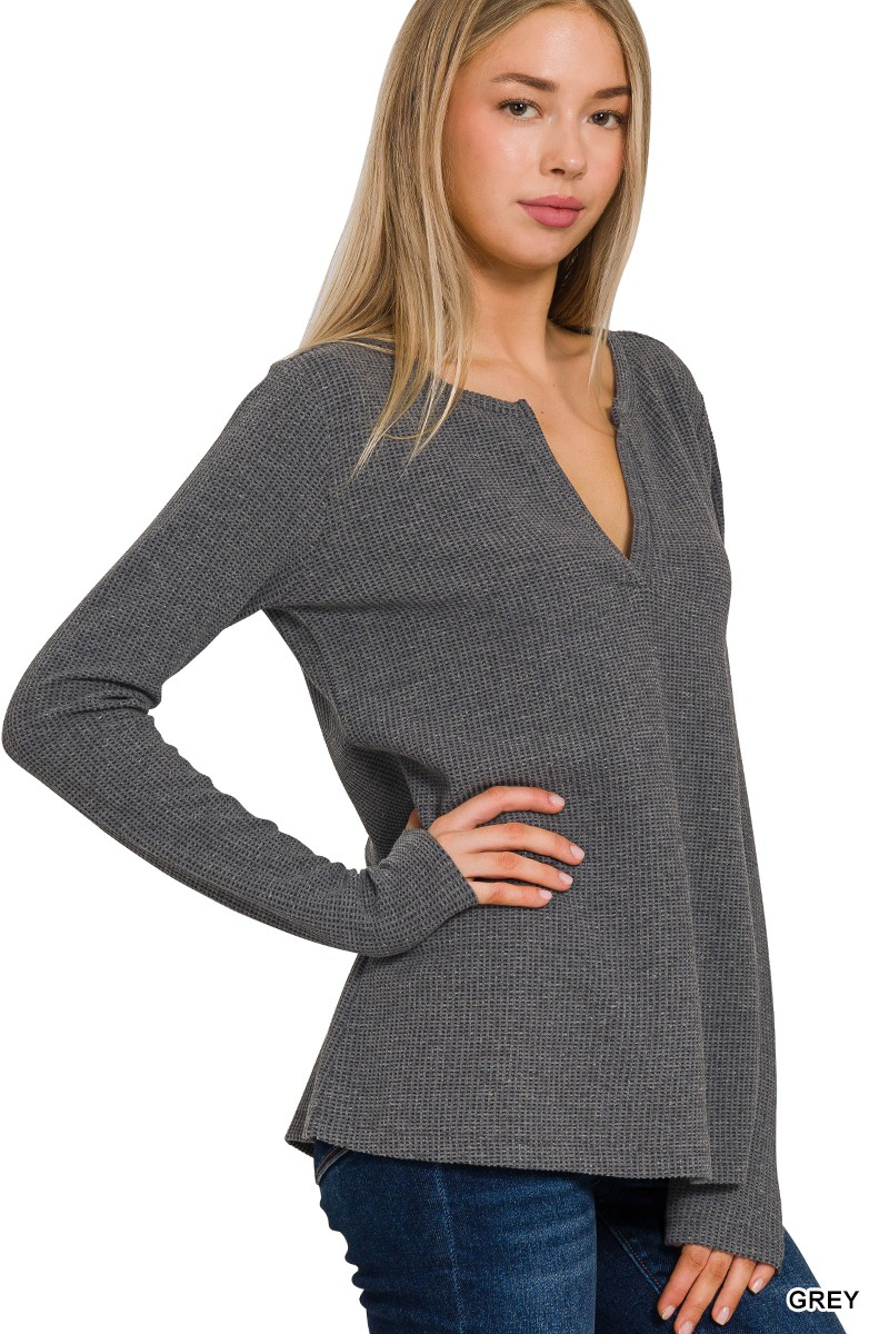 Melange Waffle Long V Sleeve Neck Top in Grey