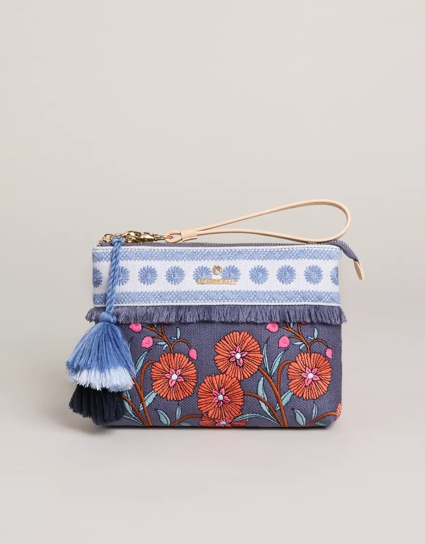 For its petite size, our embroidered bird floral, woven cotton Maci Wristlet certainly get its share of attention thanks to its gorgeous details: a double-tassel statement fob, an embroidered woven band lined with fluffy fringe, and a soft, Napa leather wristlet strap. The custom striped cotton interior has plenty of space to hold your essentials, plus a zip pocket to keep you organized.