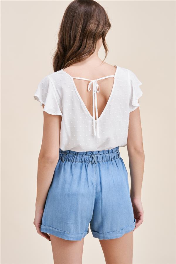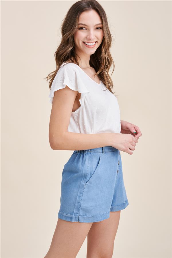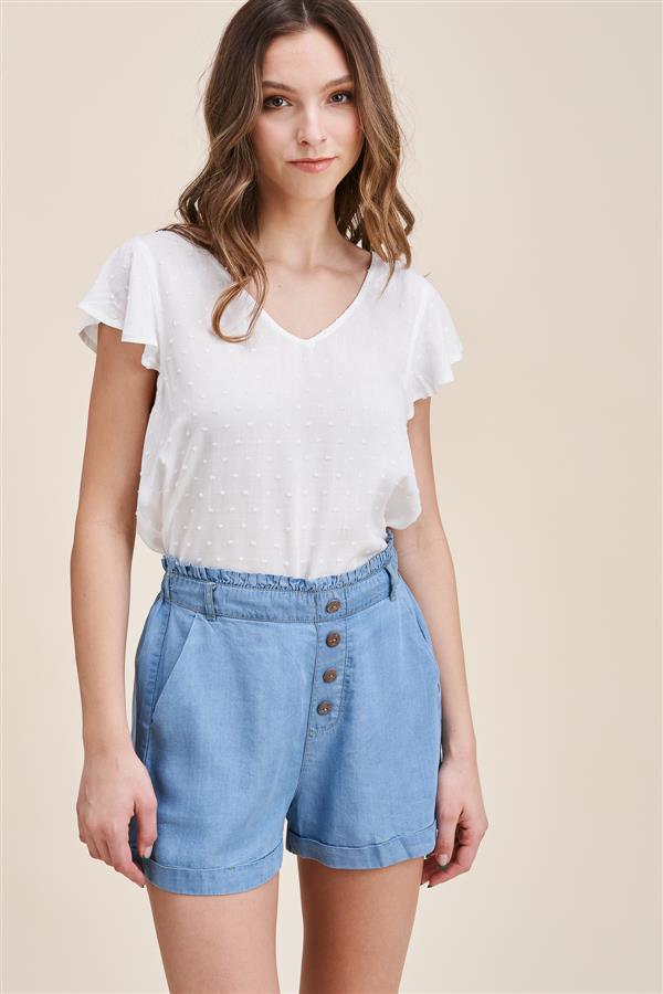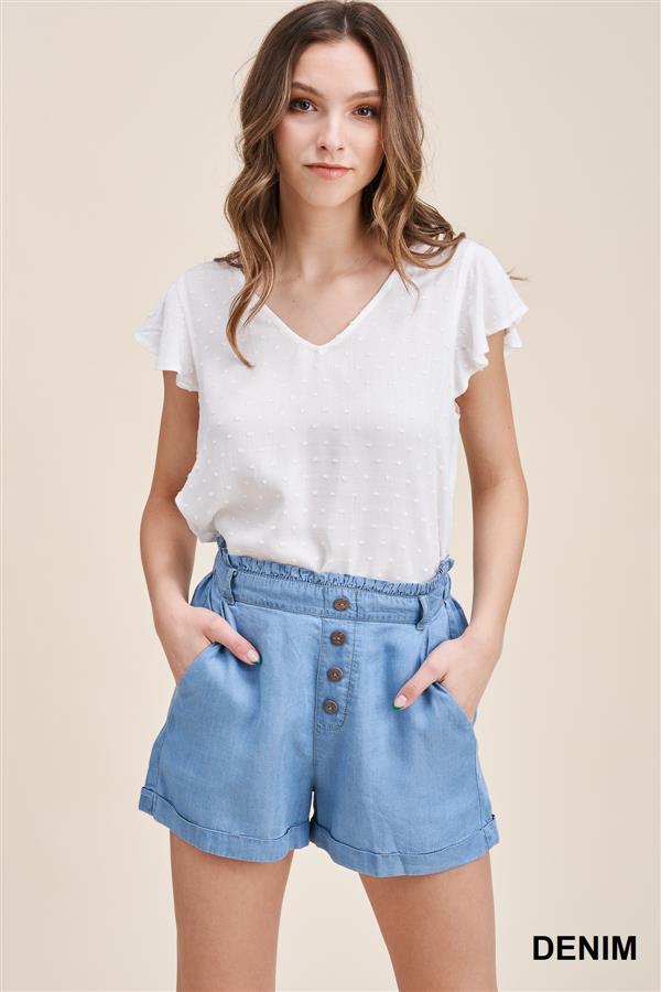 RUFFLE DETAILED TOP, NON-FUNCTIONAL BUTTON FRONT, SIDE POCKETS, PAPERBAG, WASHED TENCEL SHORTS