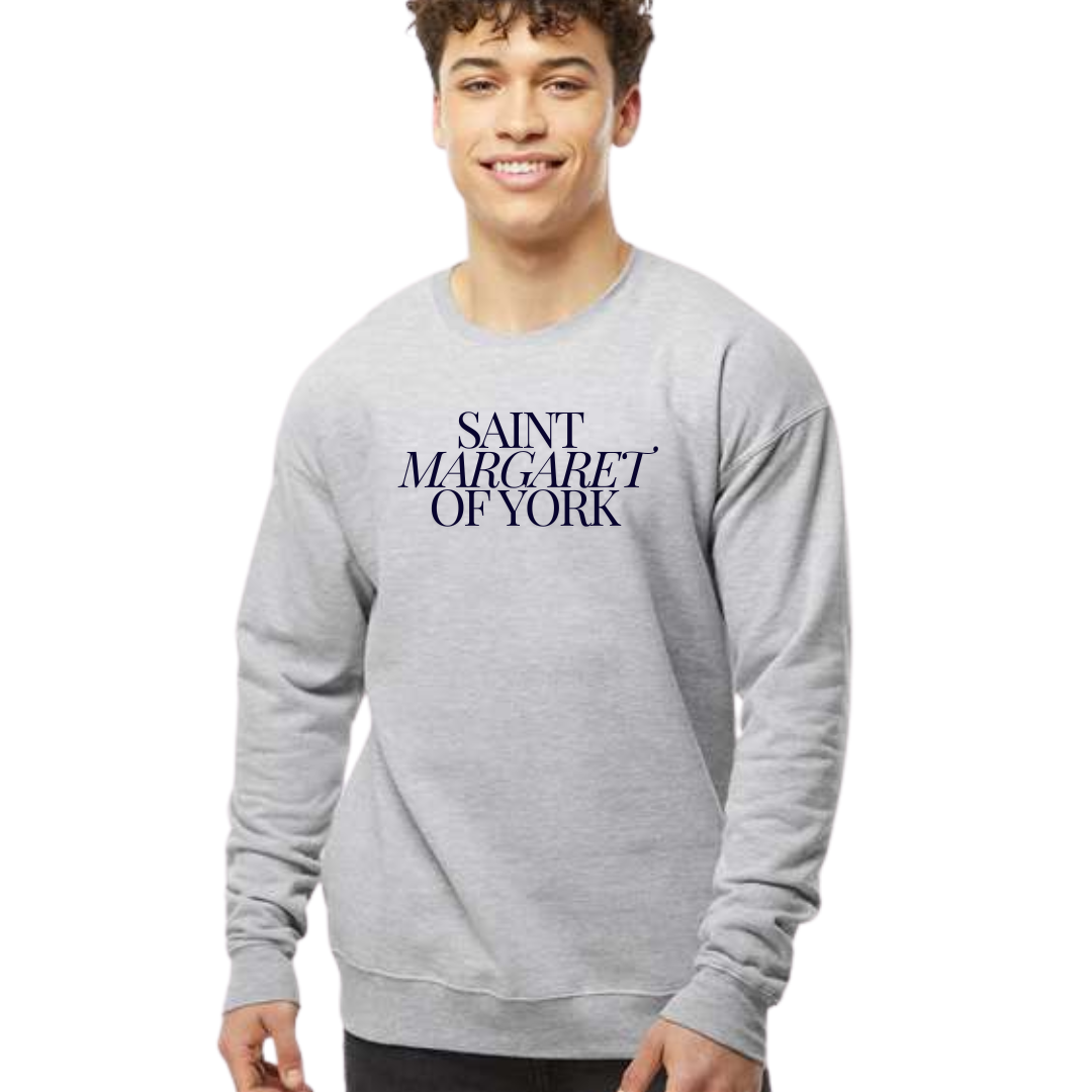 Modern Font Saint Margaret of York Crewneck Sweatshirt on Athletic Gray