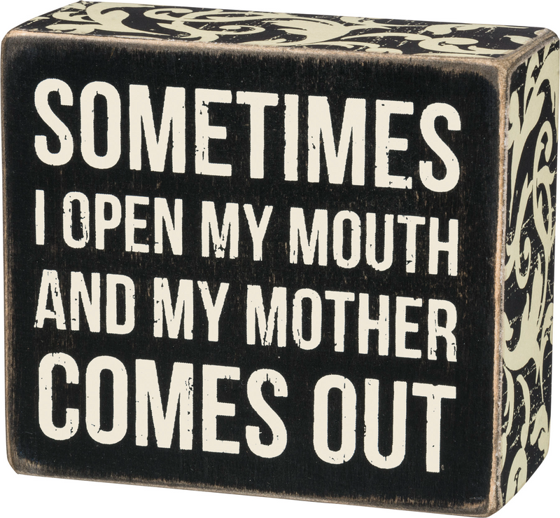 A classic black and white wooden box sign featuring a distressed "Sometimes I Open My Mouth And My Mother Comes Out" sentiment with floral abstract trim designs. Easy to hang or can free-stand alone.
