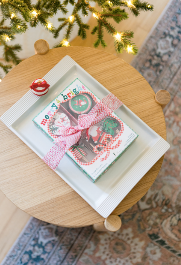 bring a little christmas decorating cheer to your platter or home decor piece! bright red and pearl white stripes are perfectly accented with a tiny gold hanger!