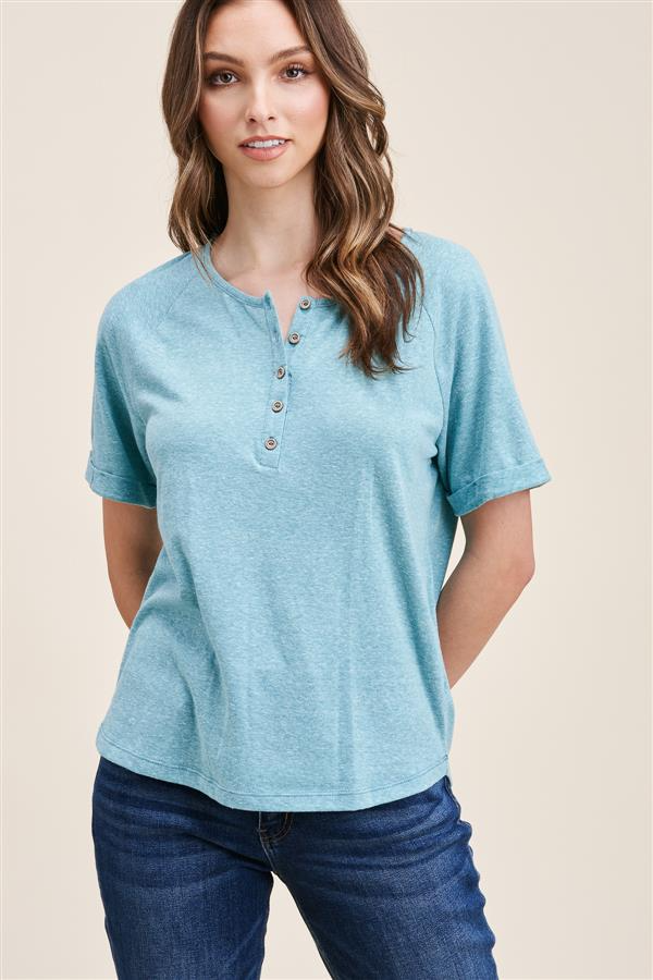 HENLEY BUTTON NECK, SHORT SLEEVE, POLY COTTON SOLID TOP
