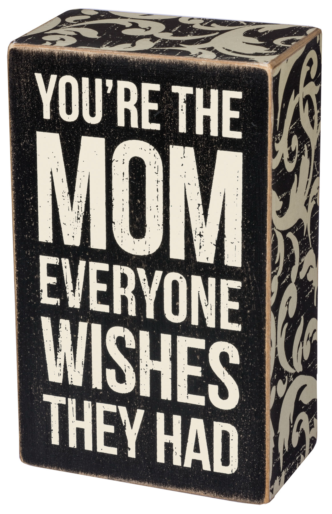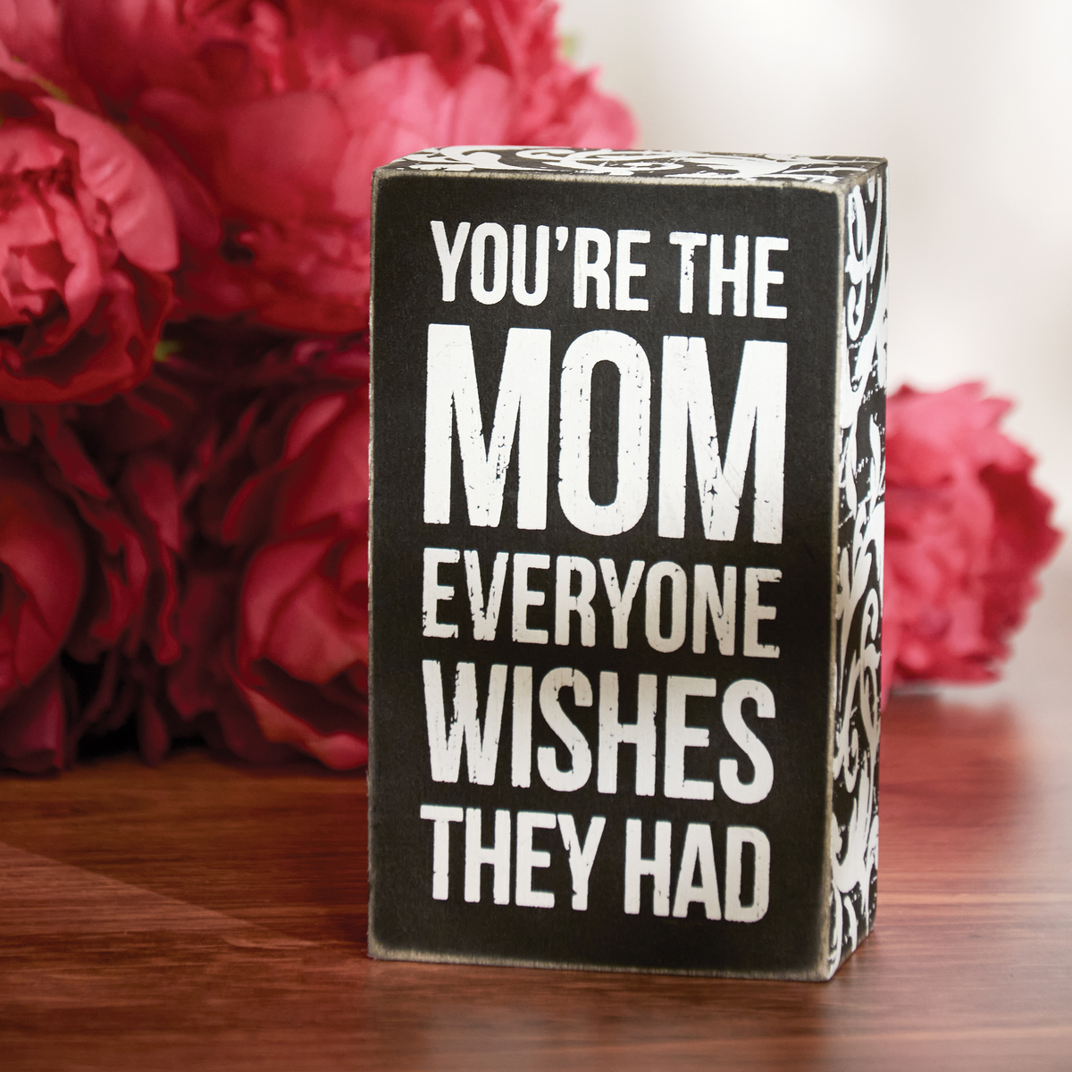 A classic black and white wooden box sign featuring a distressed "You're The Mom Everyone Wishes They Had" sentiment with floral abstract trim designs. Our The Mom box sign is easy to hang or can free-stand alone.