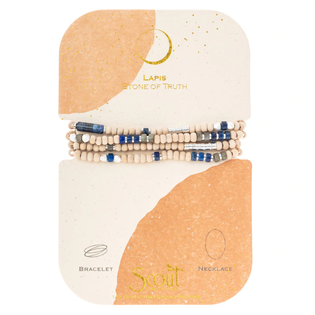 A trio of natural gemstone, organic wood and metal beads mix it up to create this lightweight wearable beauty. Wrap as a bracelet or wear as a necklace. Can be wrapped 3-4 times as a bracelet and 1-2 times as a necklace.