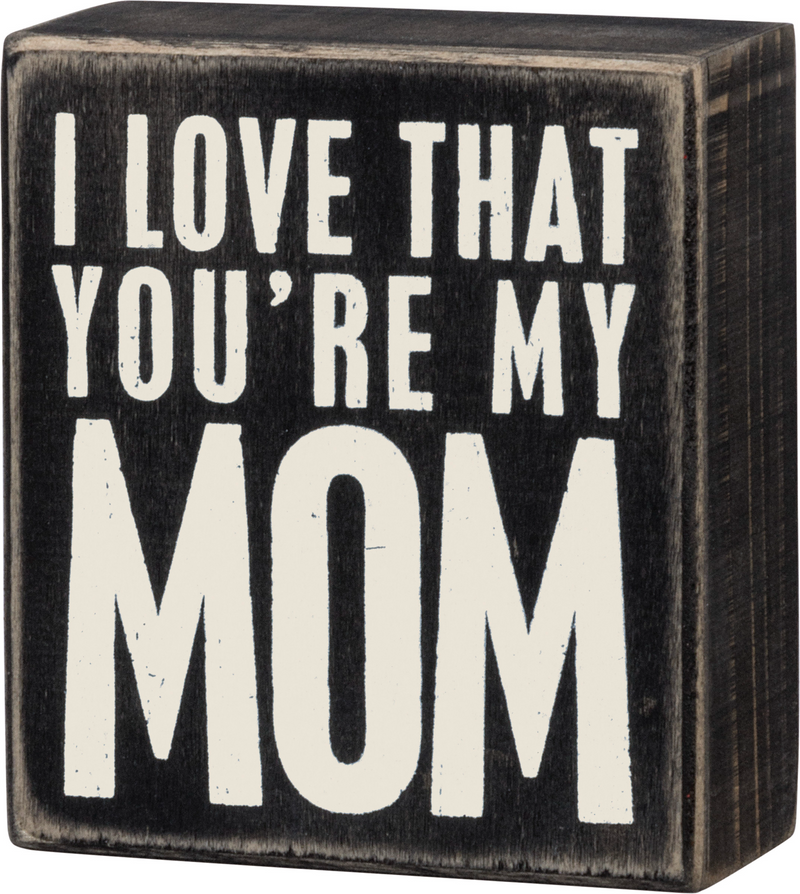 A classic black and white wooden box sign featuring a distressed "I Love That You're My Mom" sentiment. Easy to hang or can free-stand alone.